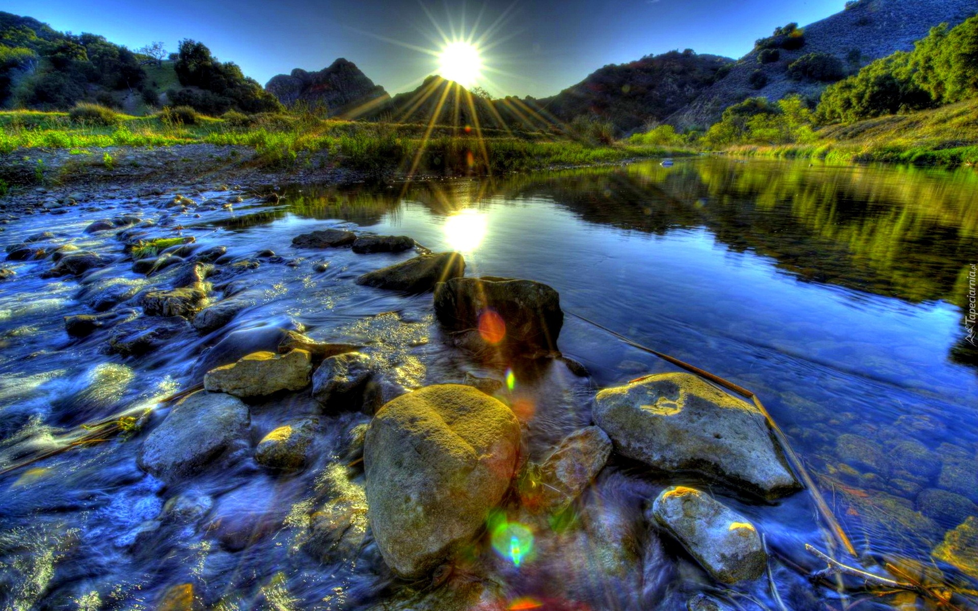 Edytor tapety: Słońce, Jezioro, Góry, Kamienie