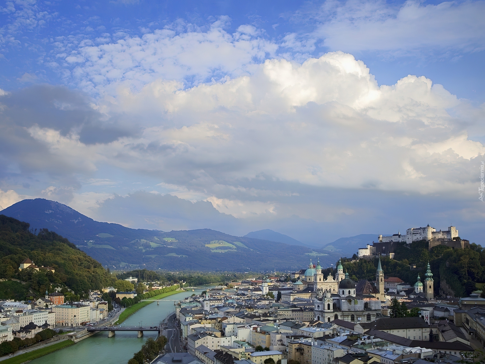 Edytor tapety: Panorama, Miasta, Rzeka, Góry, Most