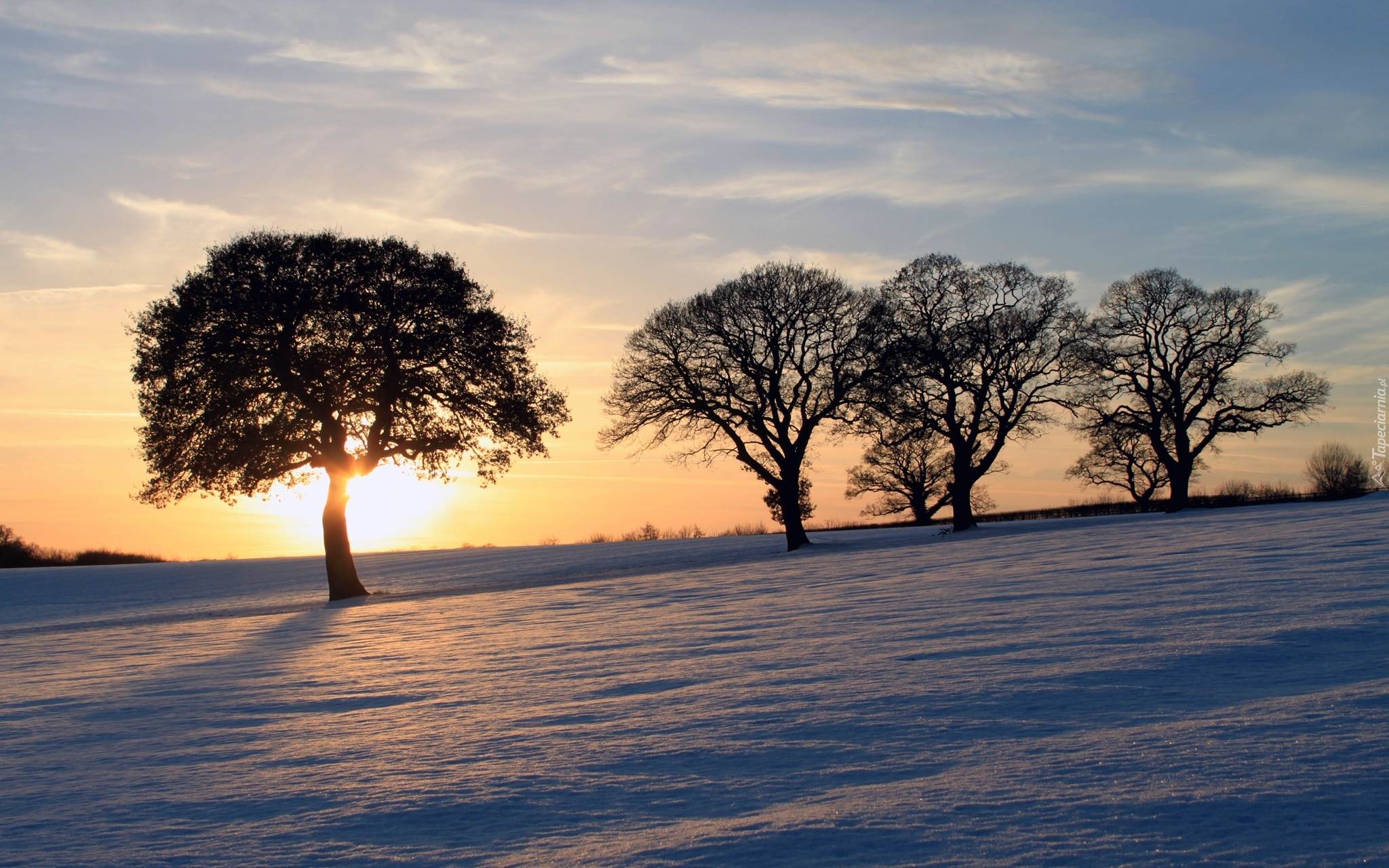 Edytor tapety: Śnieg, Drzewa, Zachodzące, Słońce