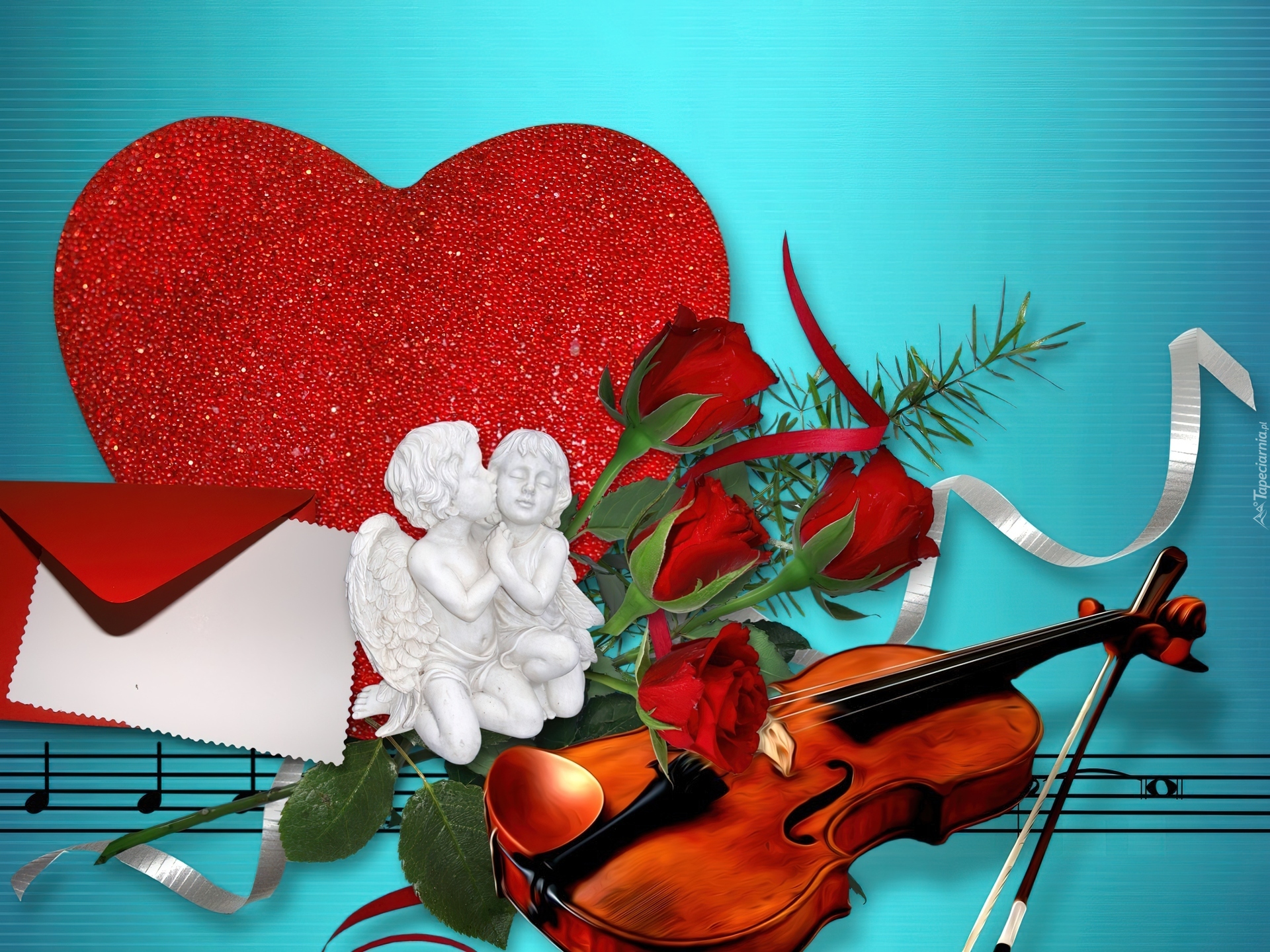 Edytor tapety: Walentynki, Serce, Skrzypce, Figurki, Róże