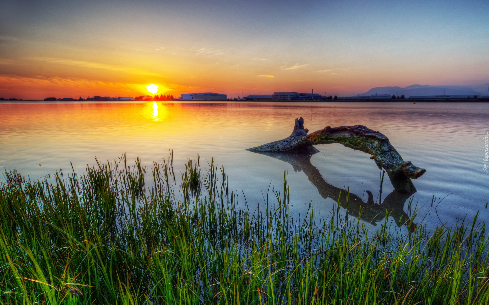 Edytor tapety: Jezioro, Szuwary, Zachód Słońca