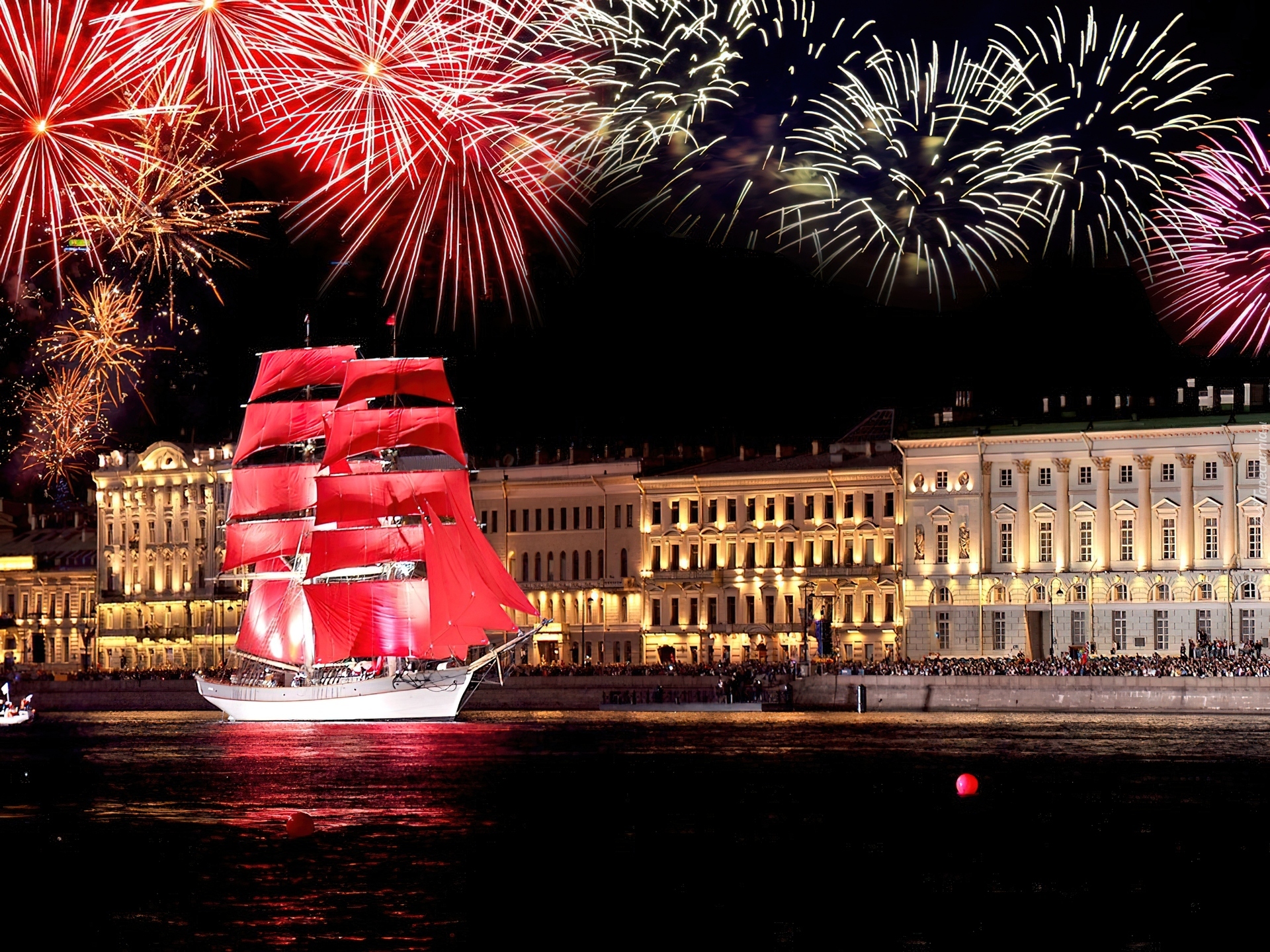 Edytor tapety: Żaglowiec, Czerwone, Żagle, Noc, Fajerwerki, Petersburg