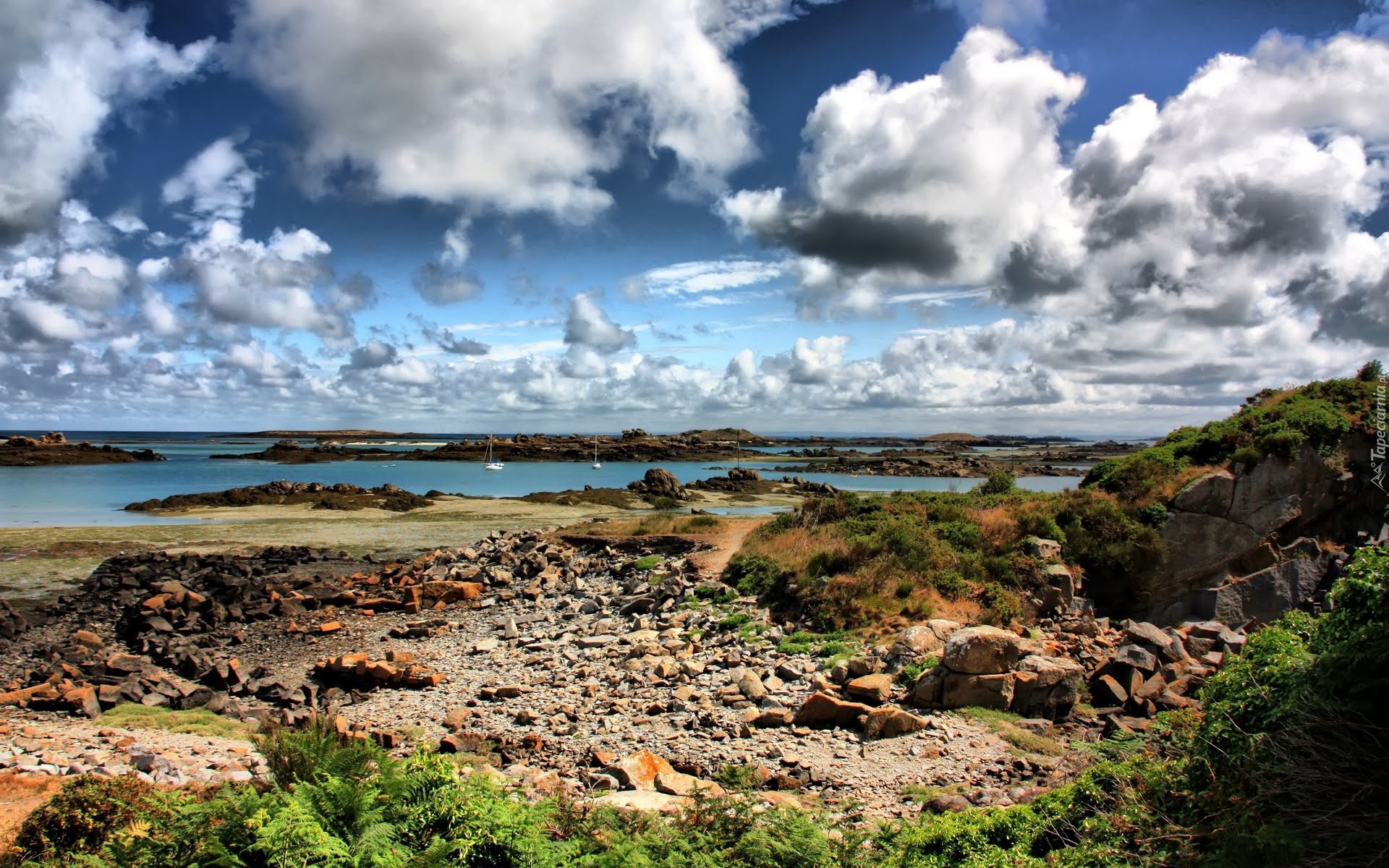 Edytor tapety: Brzeg, Kamienie, Wysepki, Niebo, Chmury