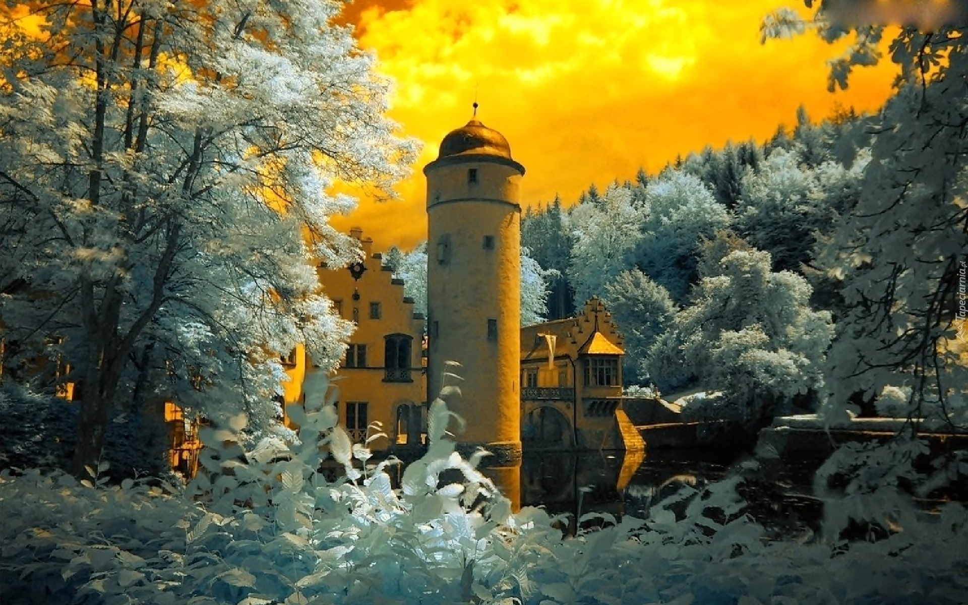 Edytor tapety: Niemcy, Bawaria, Zamek wodny Mespelbrunn, Drzewa