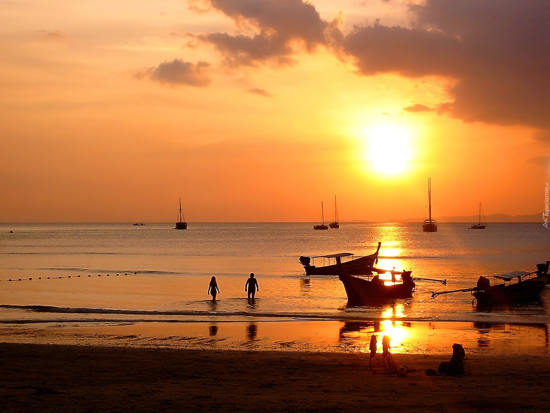 Edytor tapety: Morze, Zachód Słońca, Widoczek, Łódki