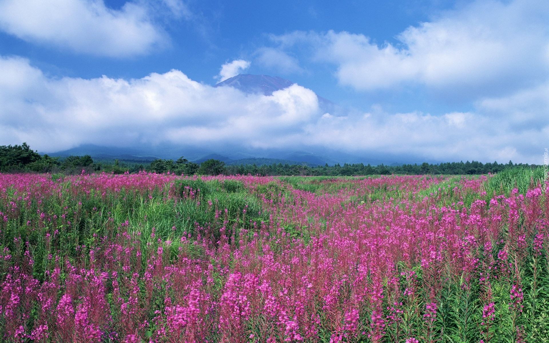 Edytor tapety: Panorama, Góry, Chmury, Łąka, Kwiaty