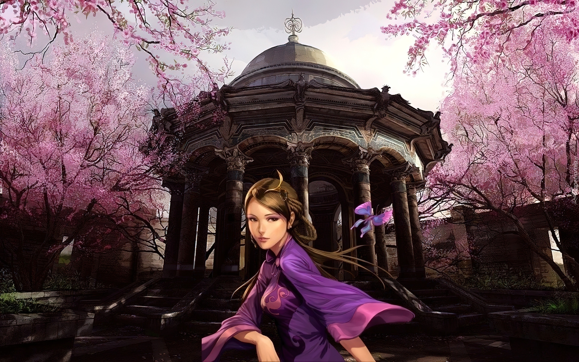 Edytor tapety: Dziewczyna, Altanka, Kwitnące, Drzewa