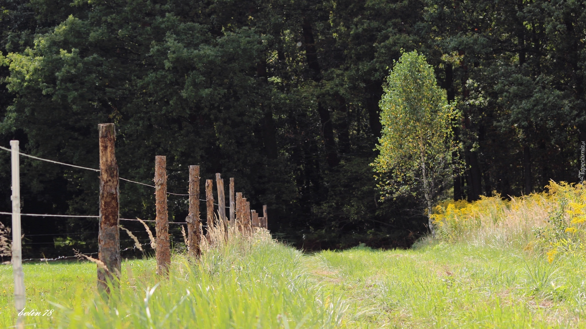 Edytor tapety: Droga, Las, Ogrodzenie, Pastwisko