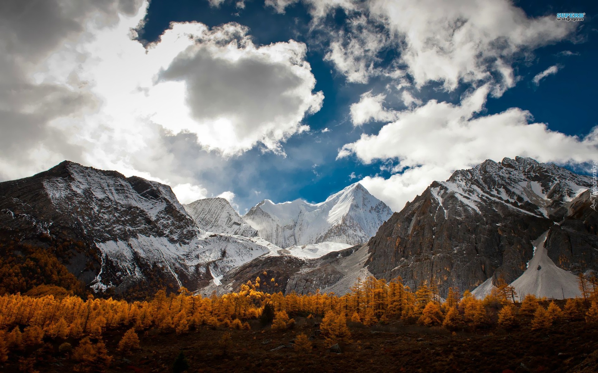 Edytor tapety: Chmury, Góry, Żółte, Świerki