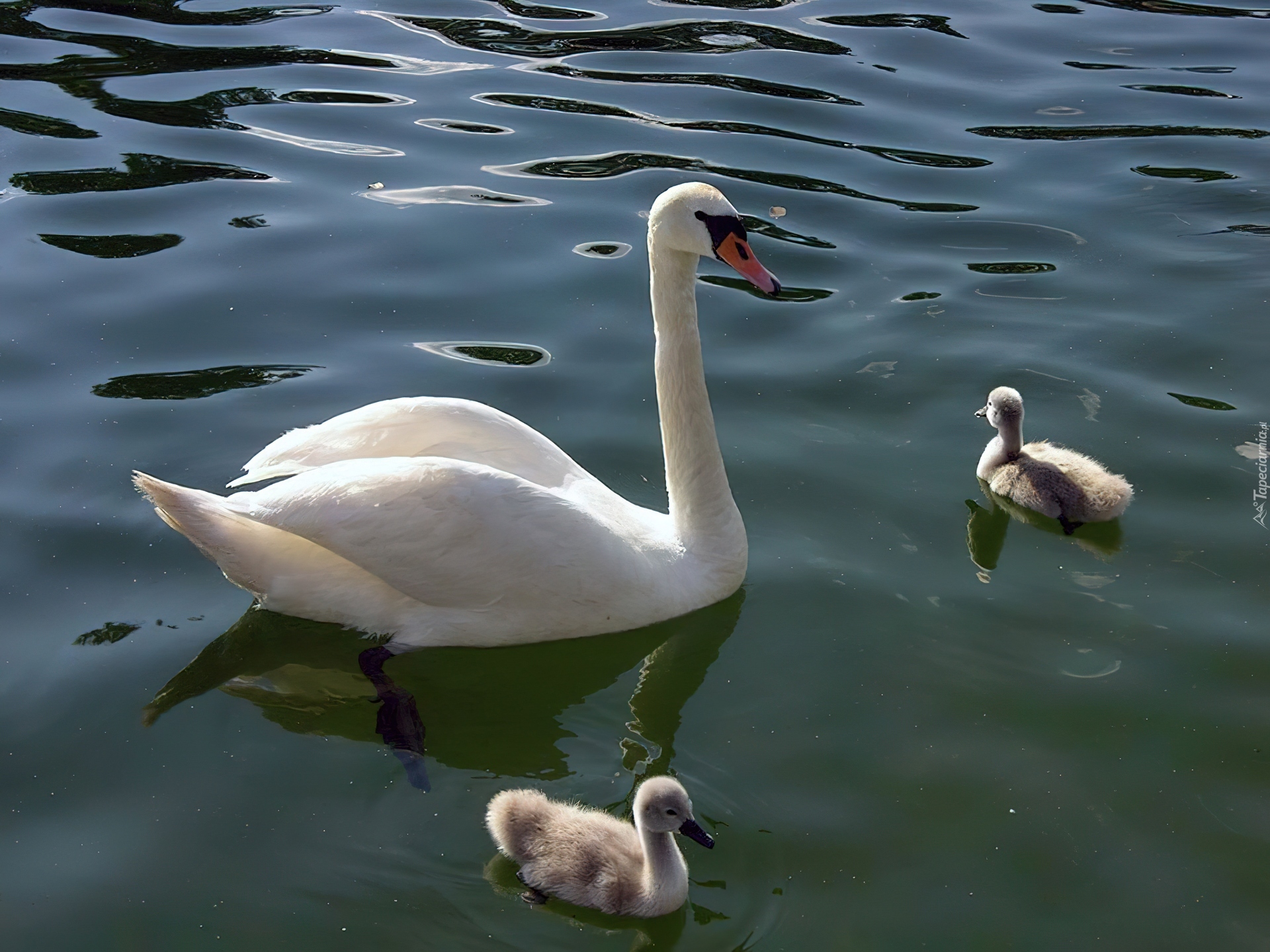 Edytor tapety: Łabędź, Pisklaki, Jezioro