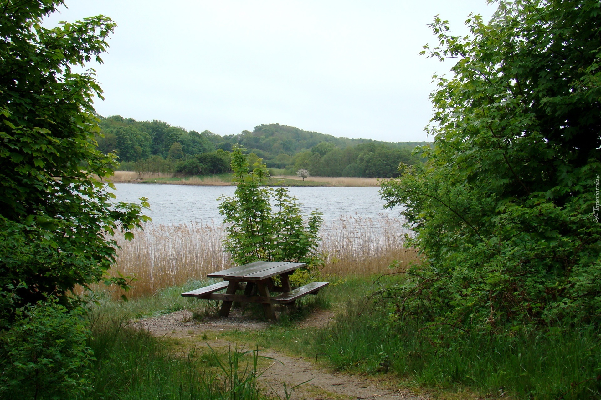 Edytor tapety: Jezioro, Ławeczka, Drzewa