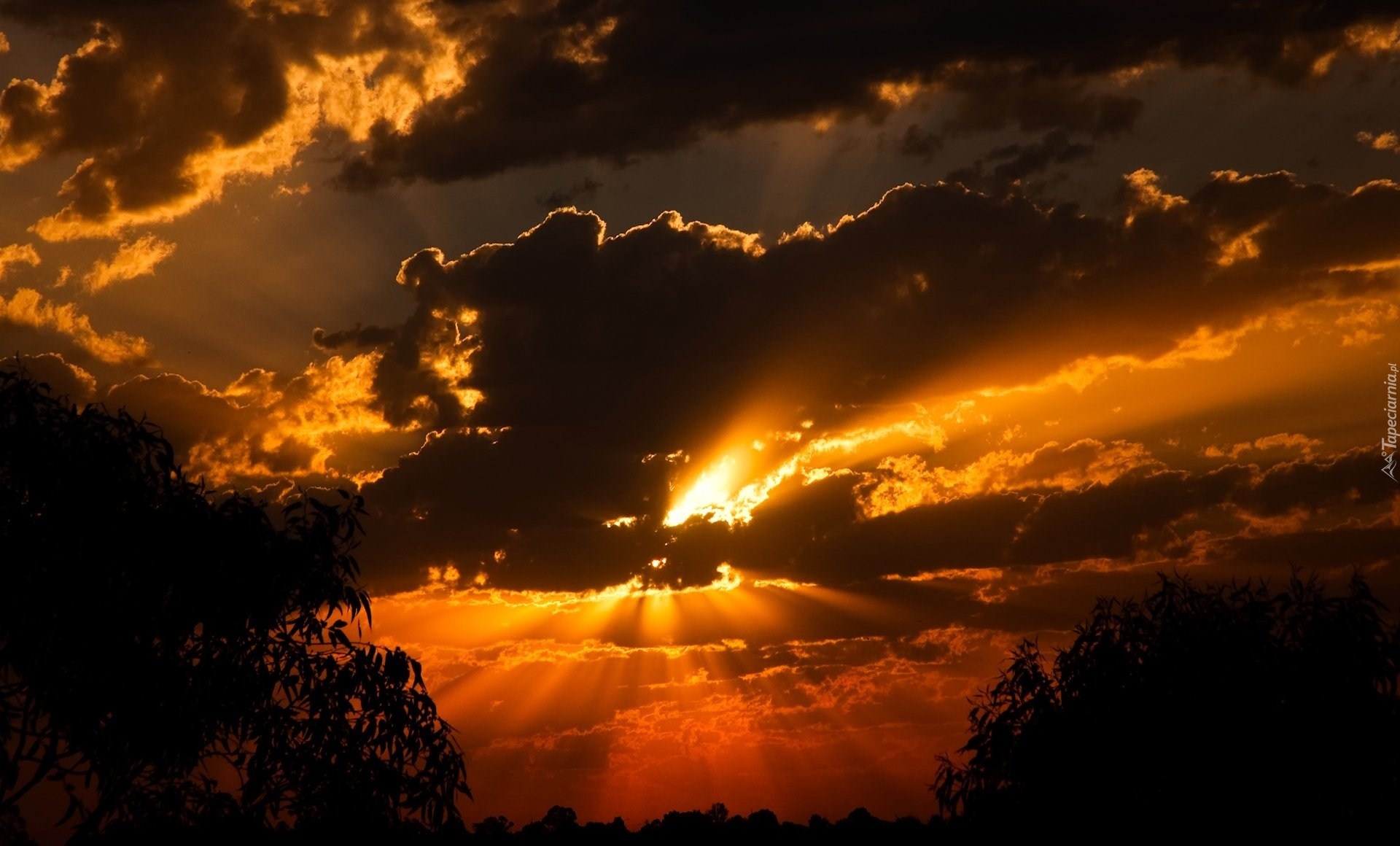 Edytor tapety: Zachód, Słońca, Chmury, Drzewa