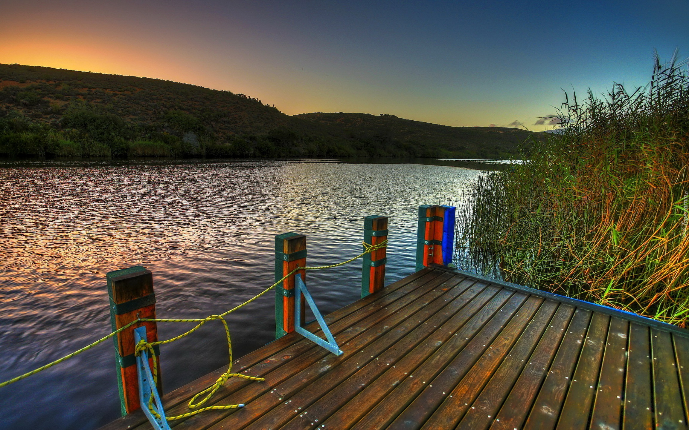 Edytor tapety: Rzeka, Szuwary, Pomost, Wzgórza