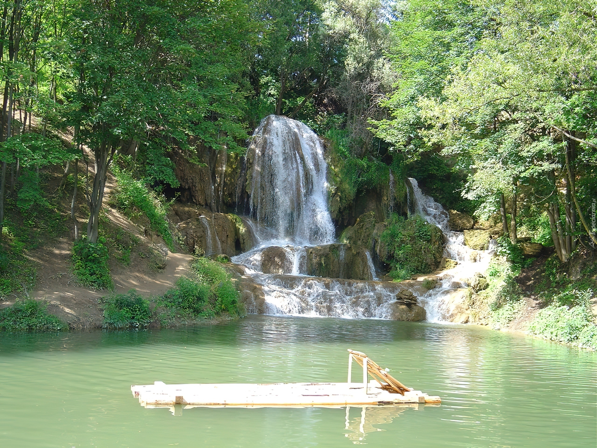 Edytor tapety: Wodospad, Drzewa, Jeziorko, Tratwa