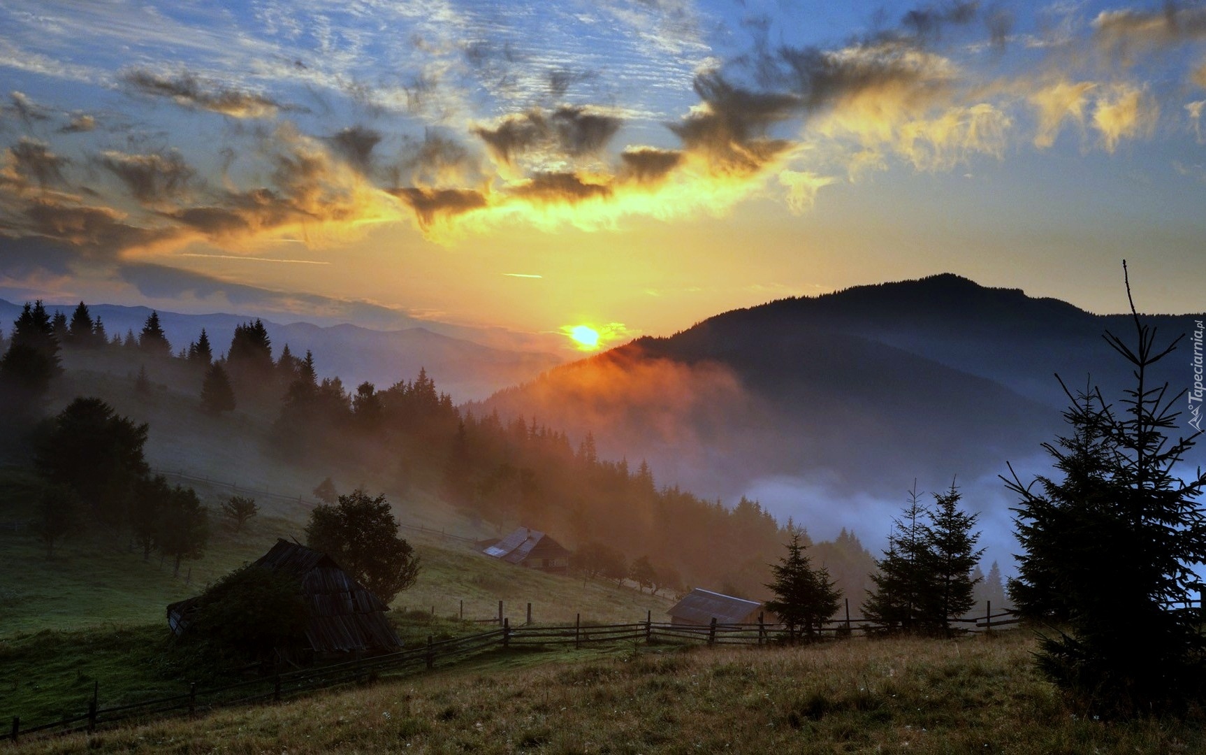 Edytor tapety: Zachodzące, Słońce, W, Górach, Łąki