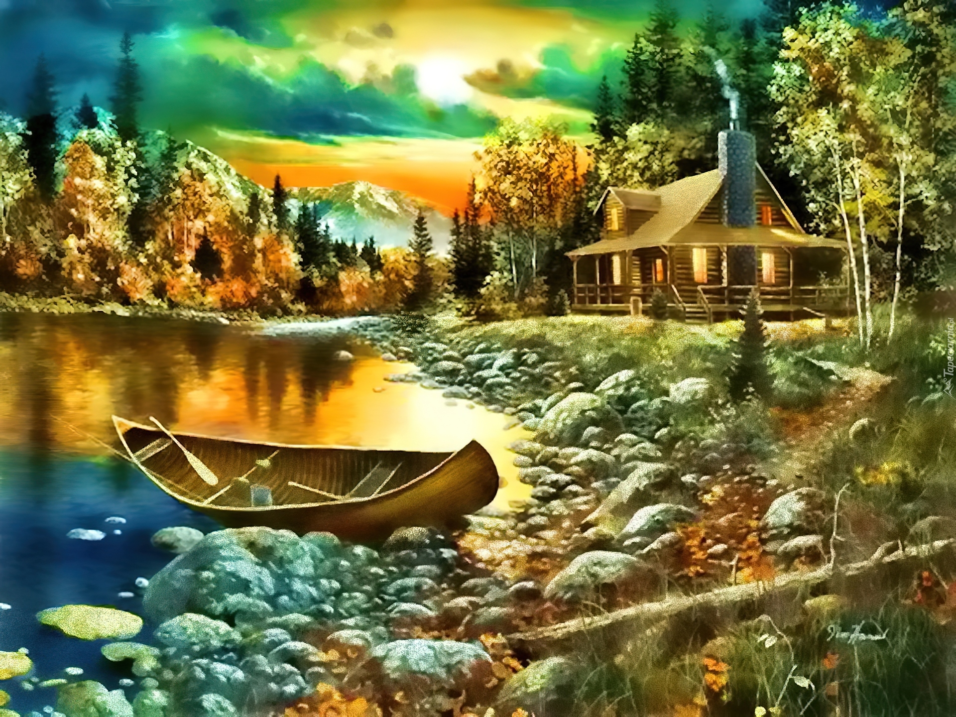 Edytor tapety: Jezioro, Domek, Łódka, Widoczek, Malarstwo