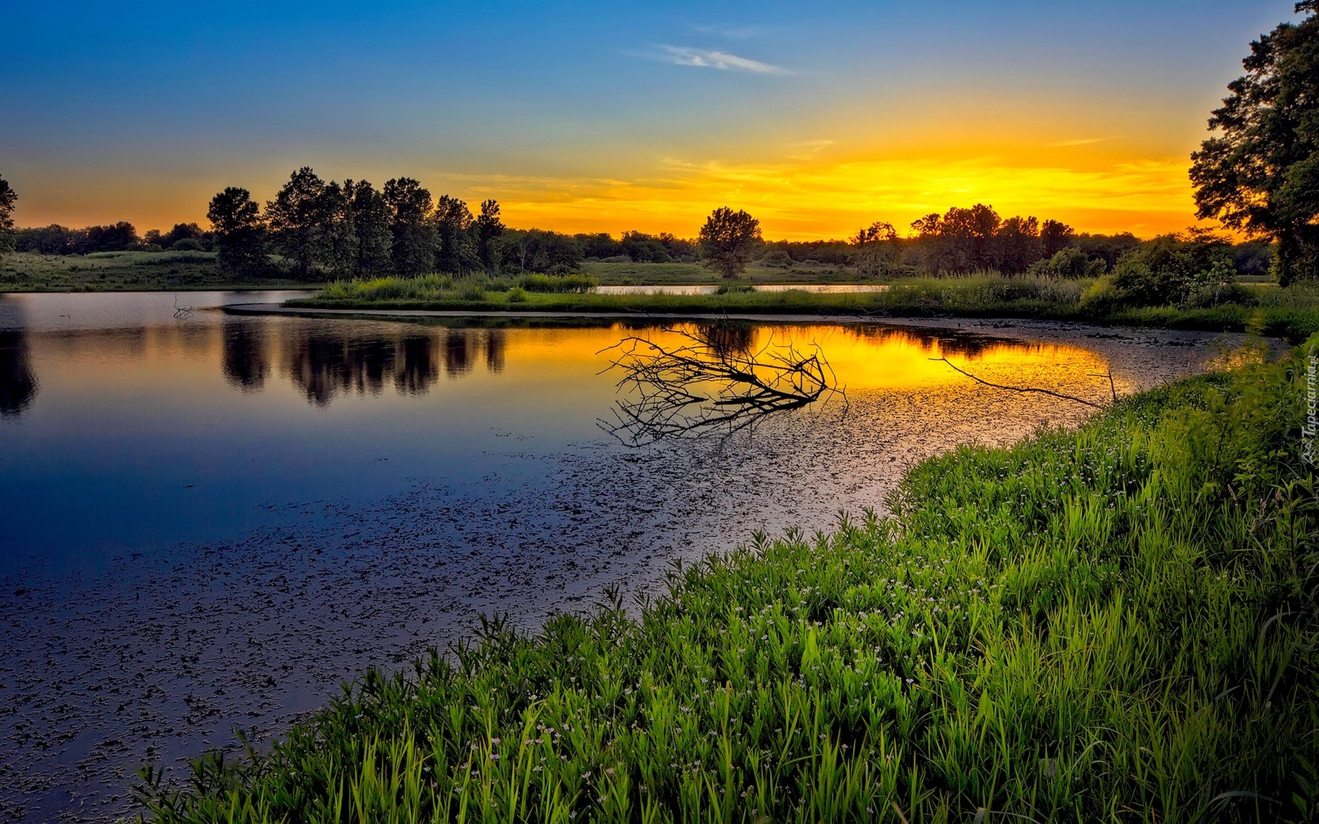 Edytor tapety: Zachód, Słońca, Jezioro, Drzewa
