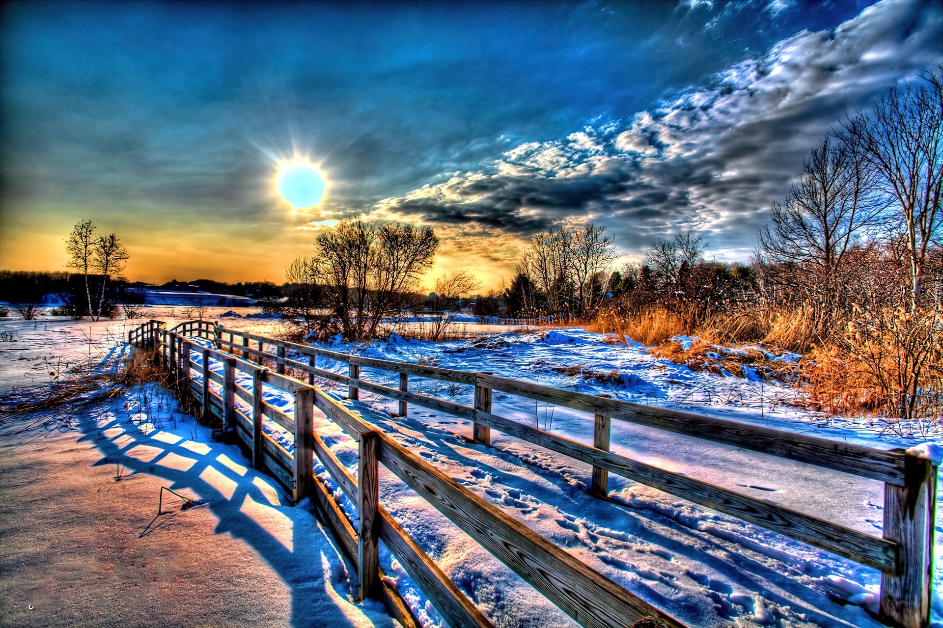 Edytor tapety: Most, Słońce, Chmury, Śnieg, Drzewa