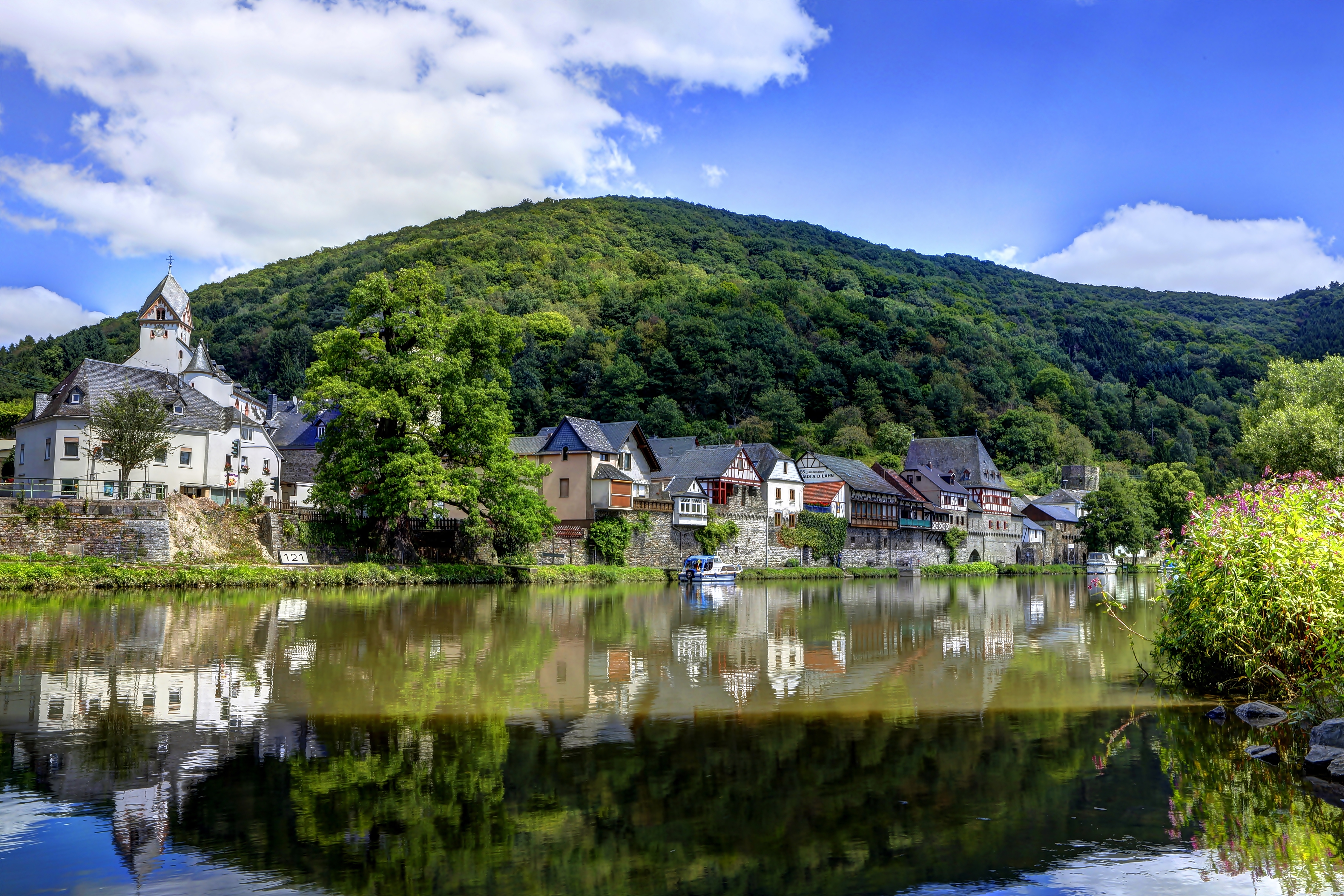 Edytor tapety: Rzeka, Domy, Lasy