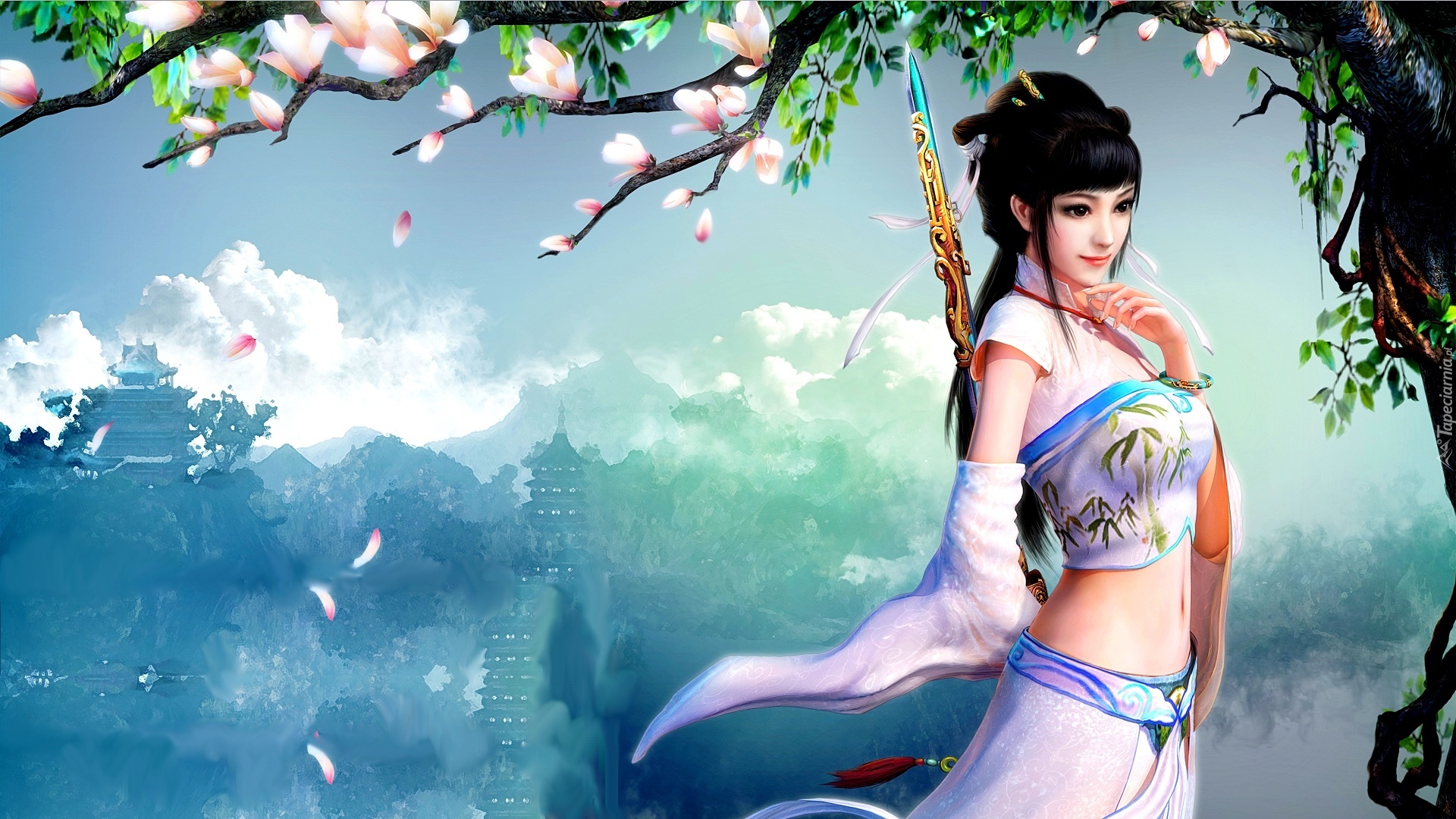 Edytor tapety: Kobieta, Broń, Góry, Chmury