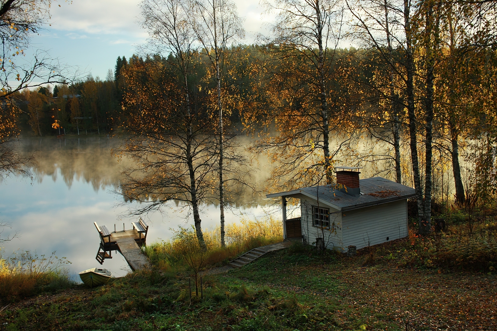 Edytor tapety: Jesień, Drzewa, Domek, Jeziorko, Pomost