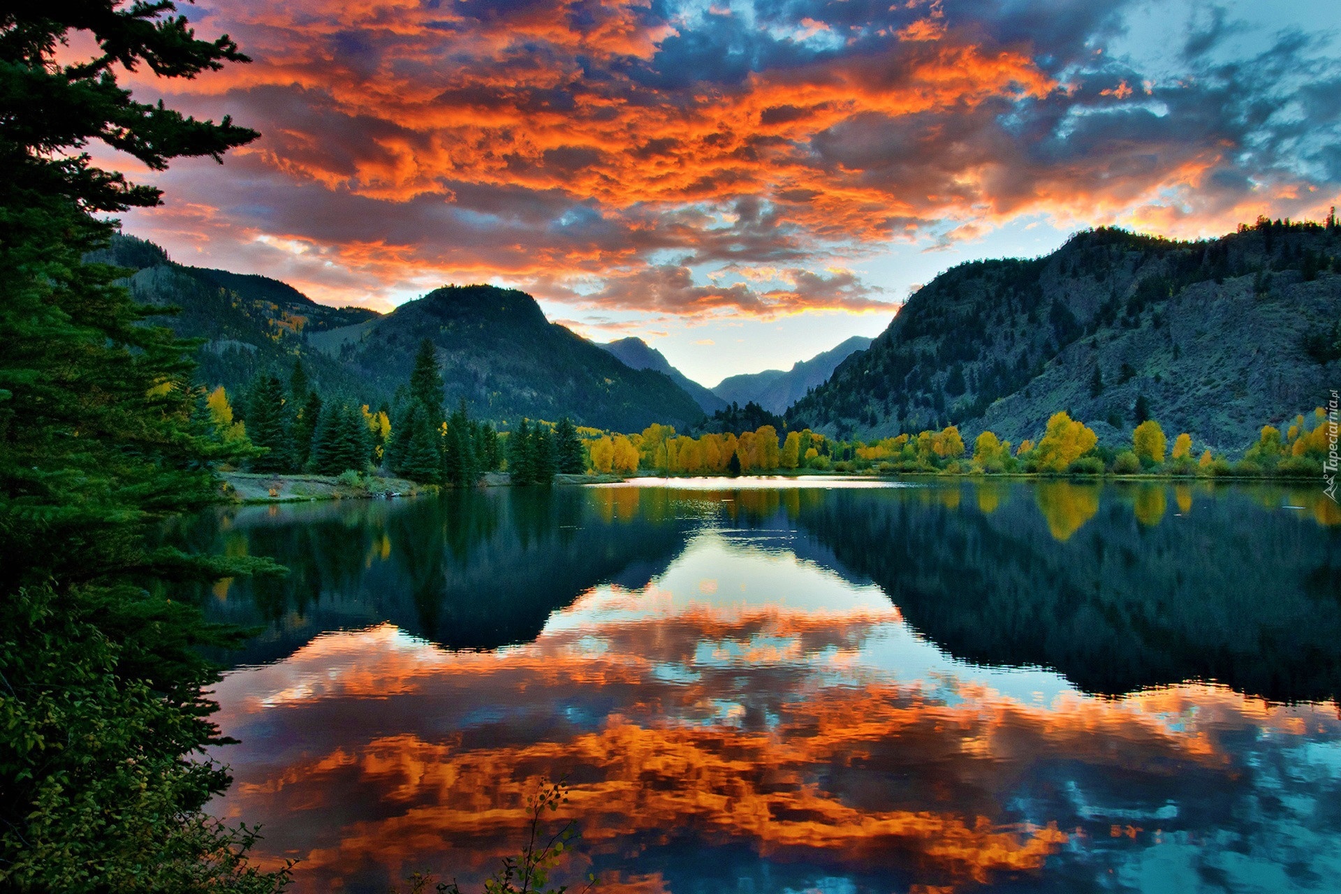 Edytor tapety: Jezioro, Góry, Pomarańczowe, Chmury, Odbicie