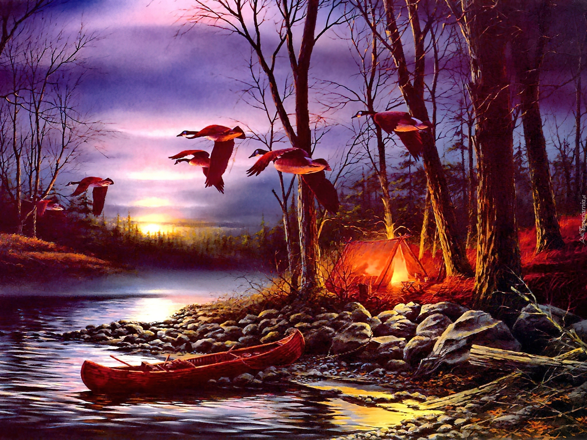 Edytor tapety: Jezioro, Kaczki, Łódka, Ognisko, Malarstwo
