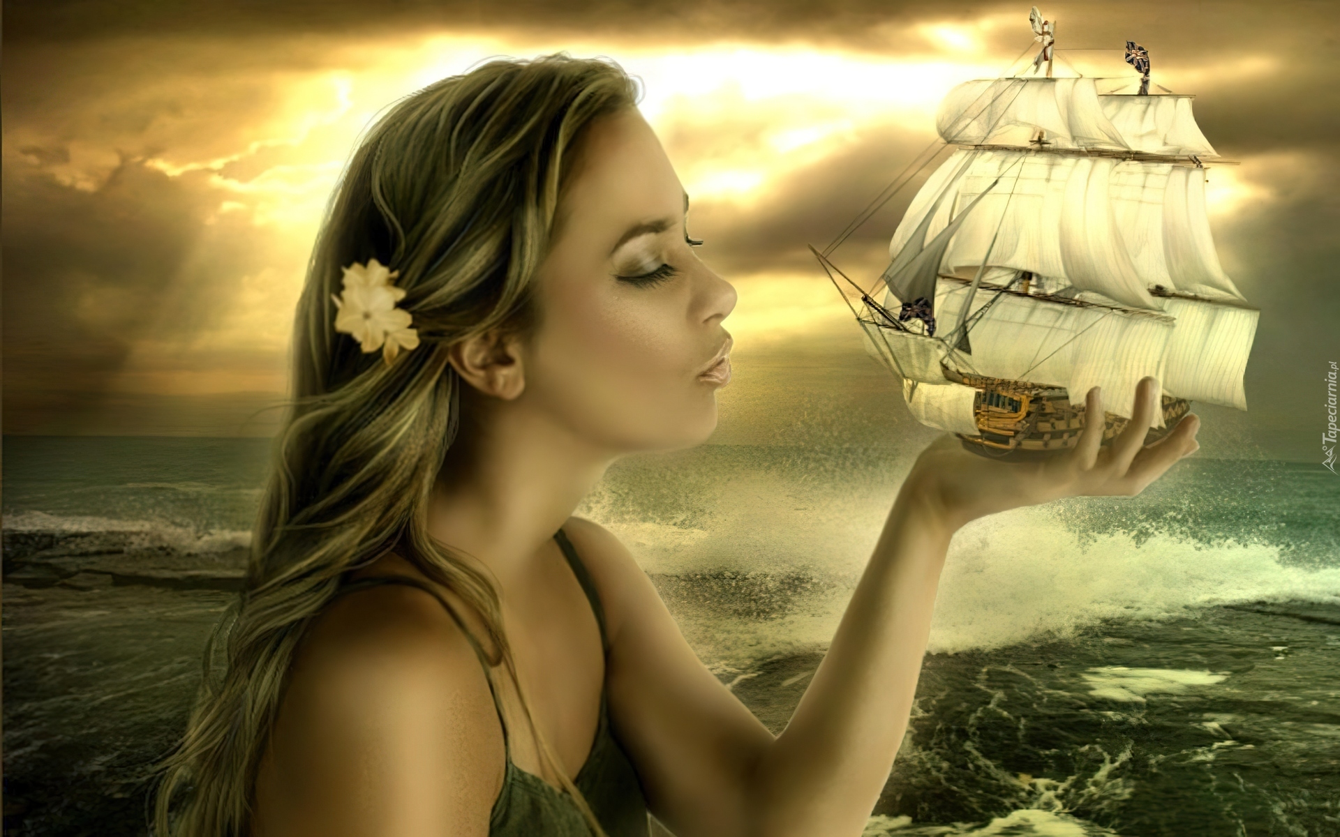 Edytor tapety: Dziewczyna, Żaglowiec, Morze
