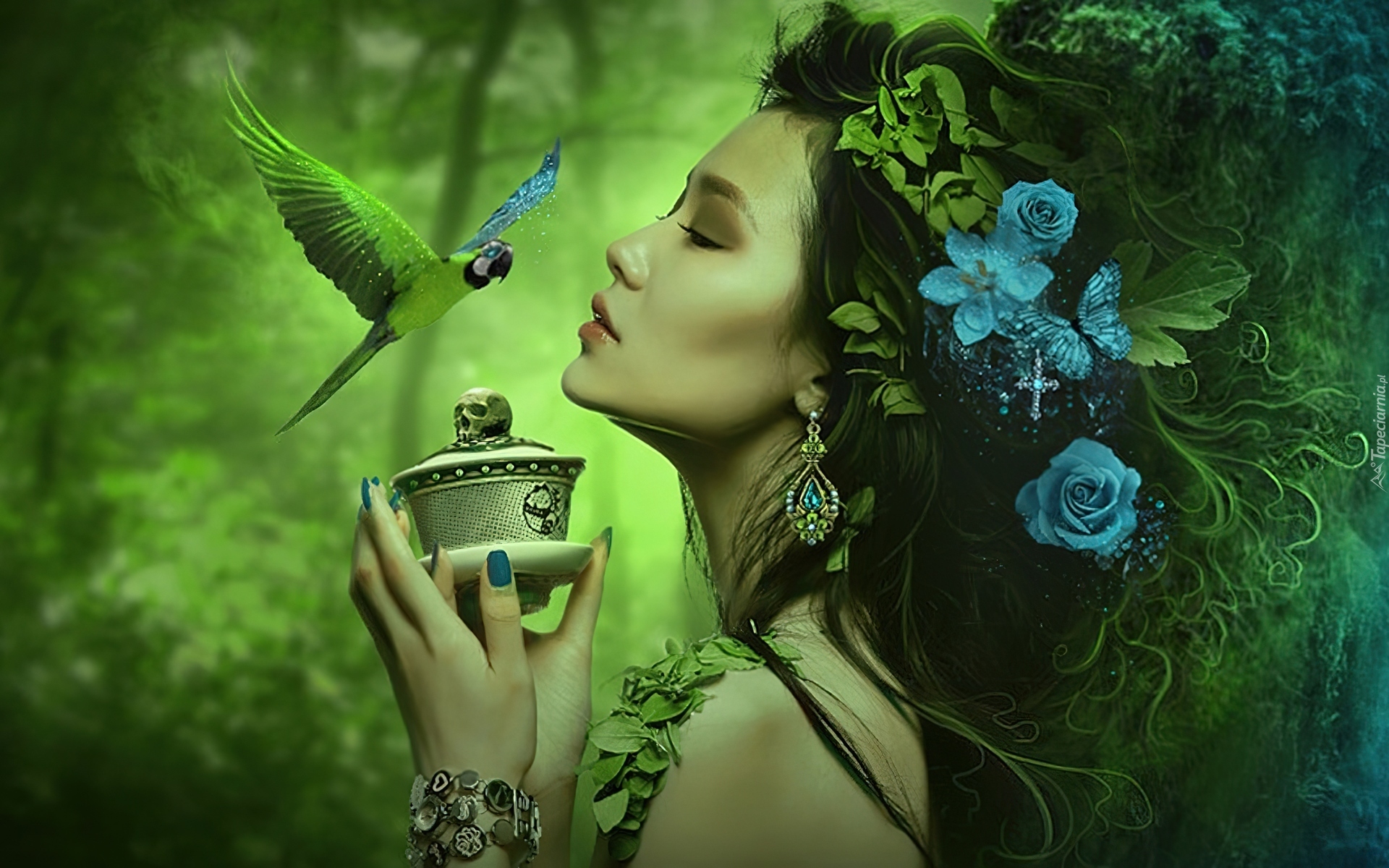 Edytor tapety: Kobieta, Papużka, Kwiaty