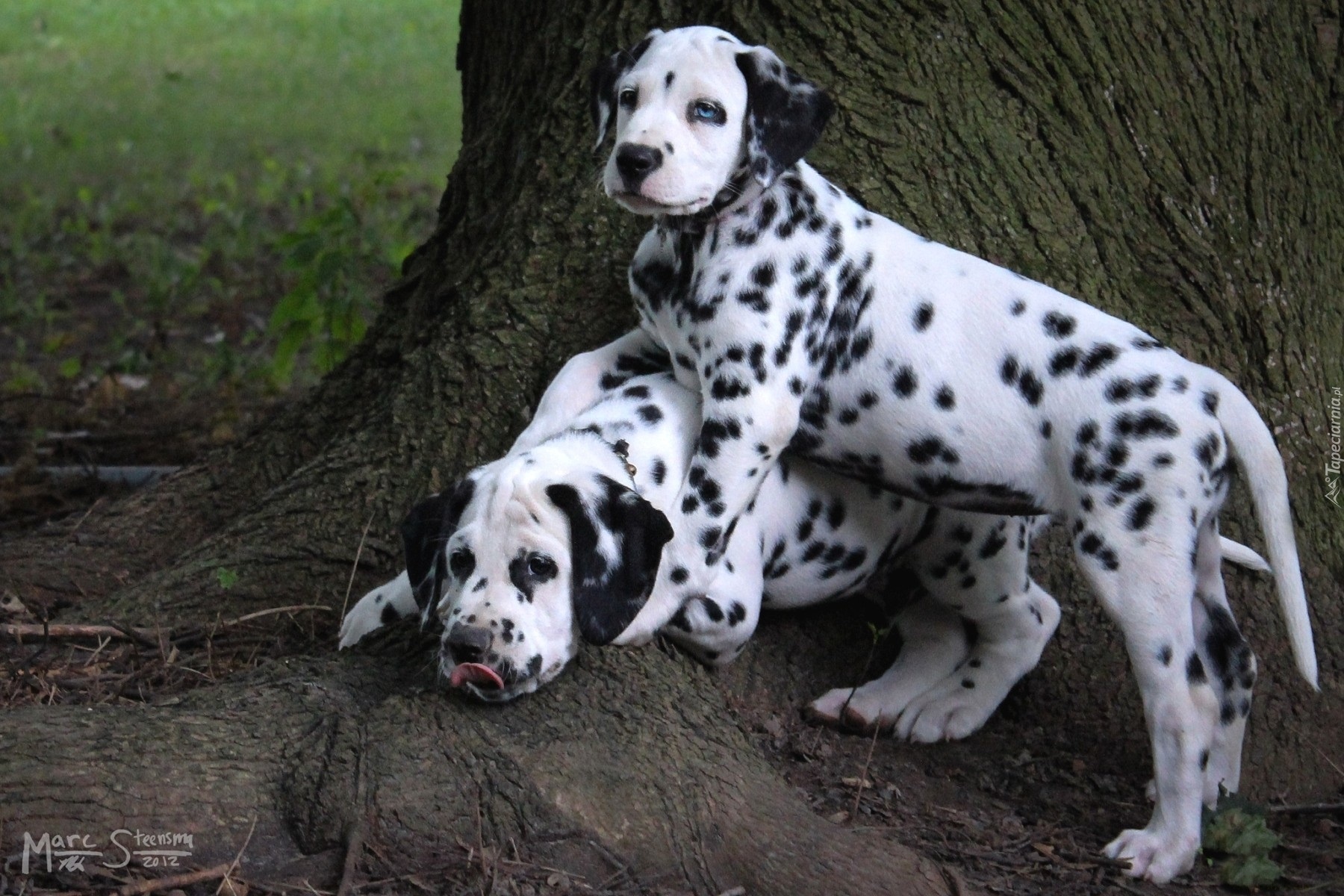 Edytor tapety: Dwa, Dalmatyńczyki, Drzewo