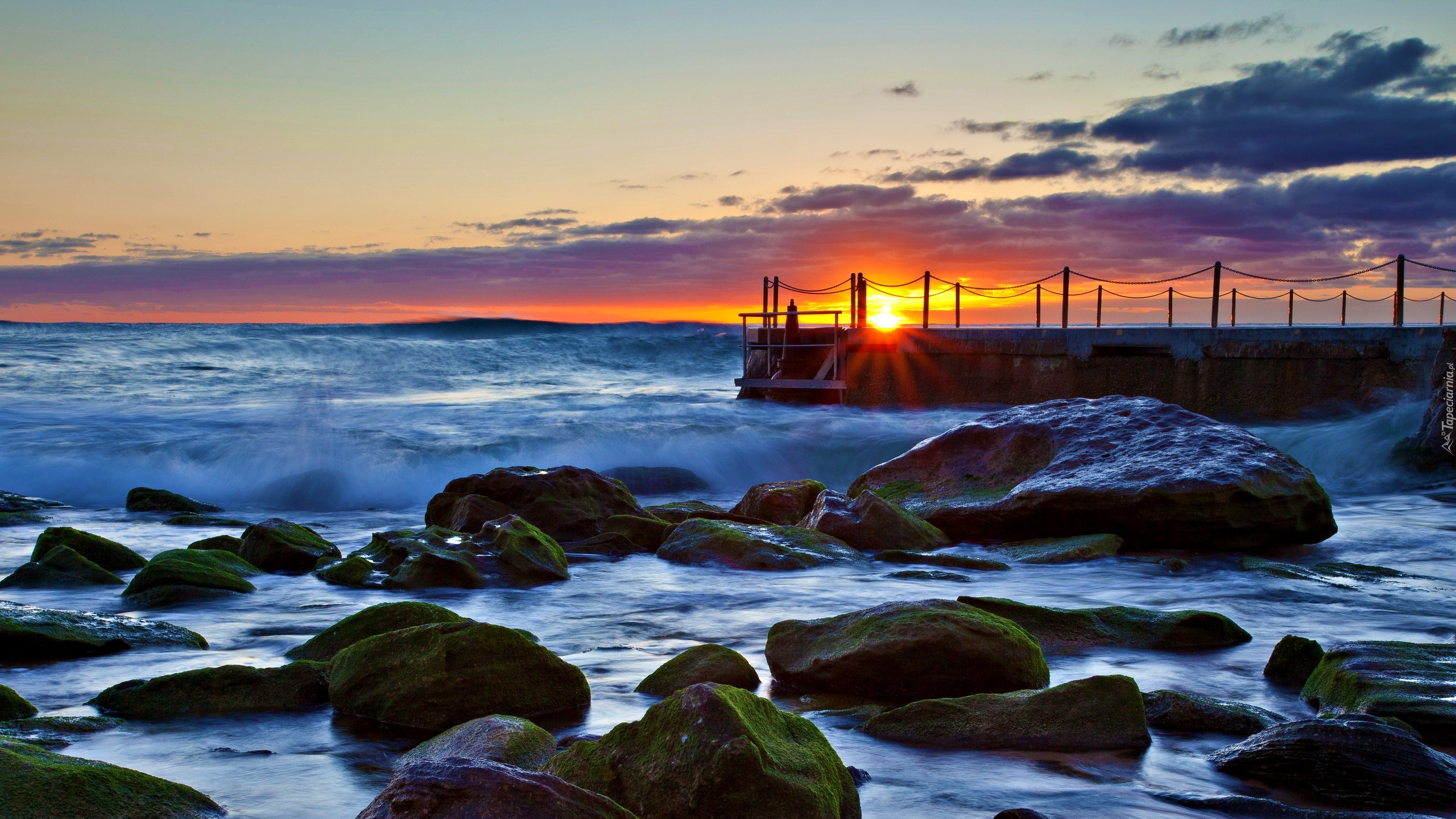 Edytor tapety: Morze, Molo, Brzeg, Kamienie, Zachód, Słońca