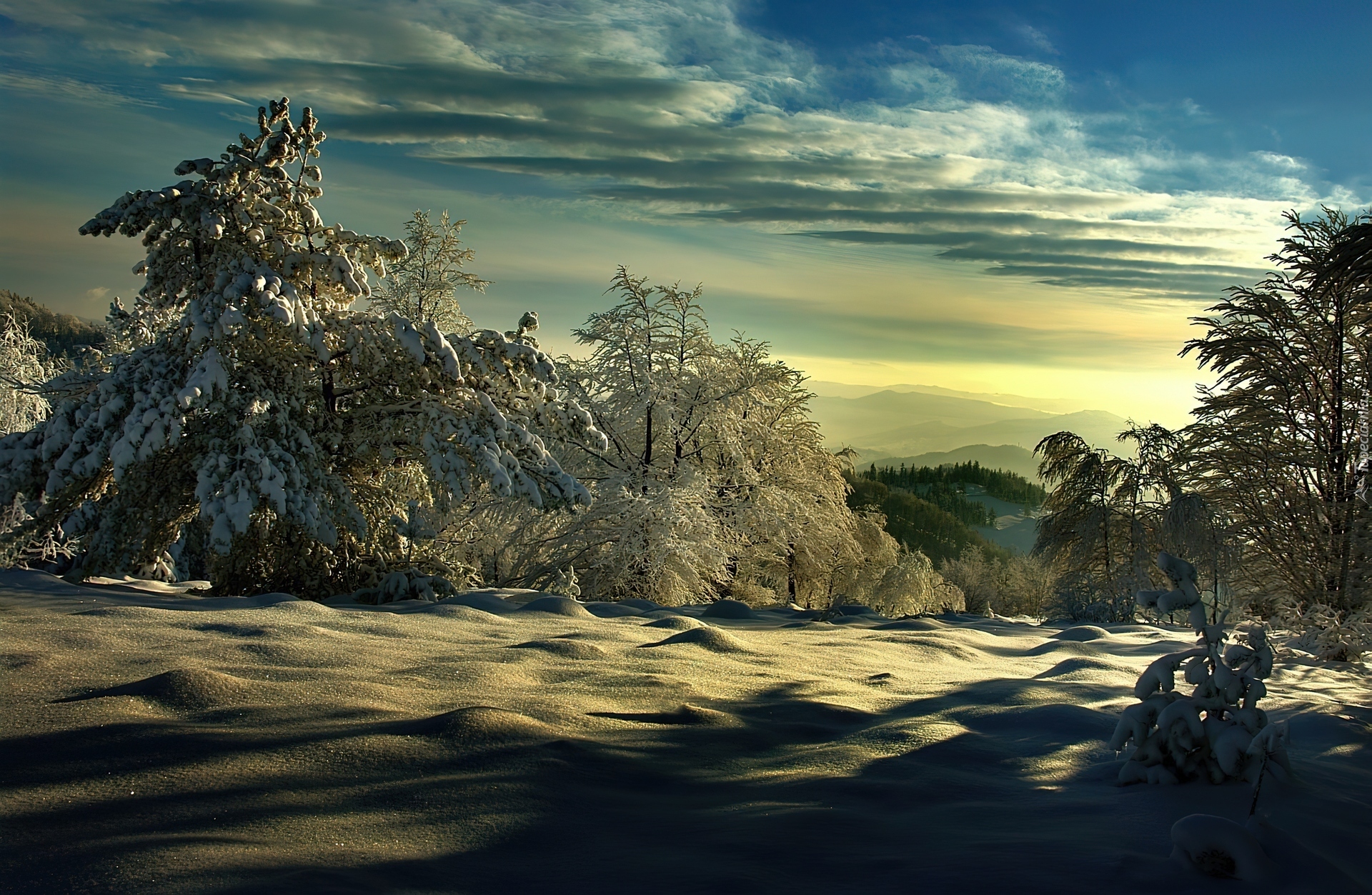 Edytor tapety: Drzewa, Pokryte, Śniegiem, Zaspy