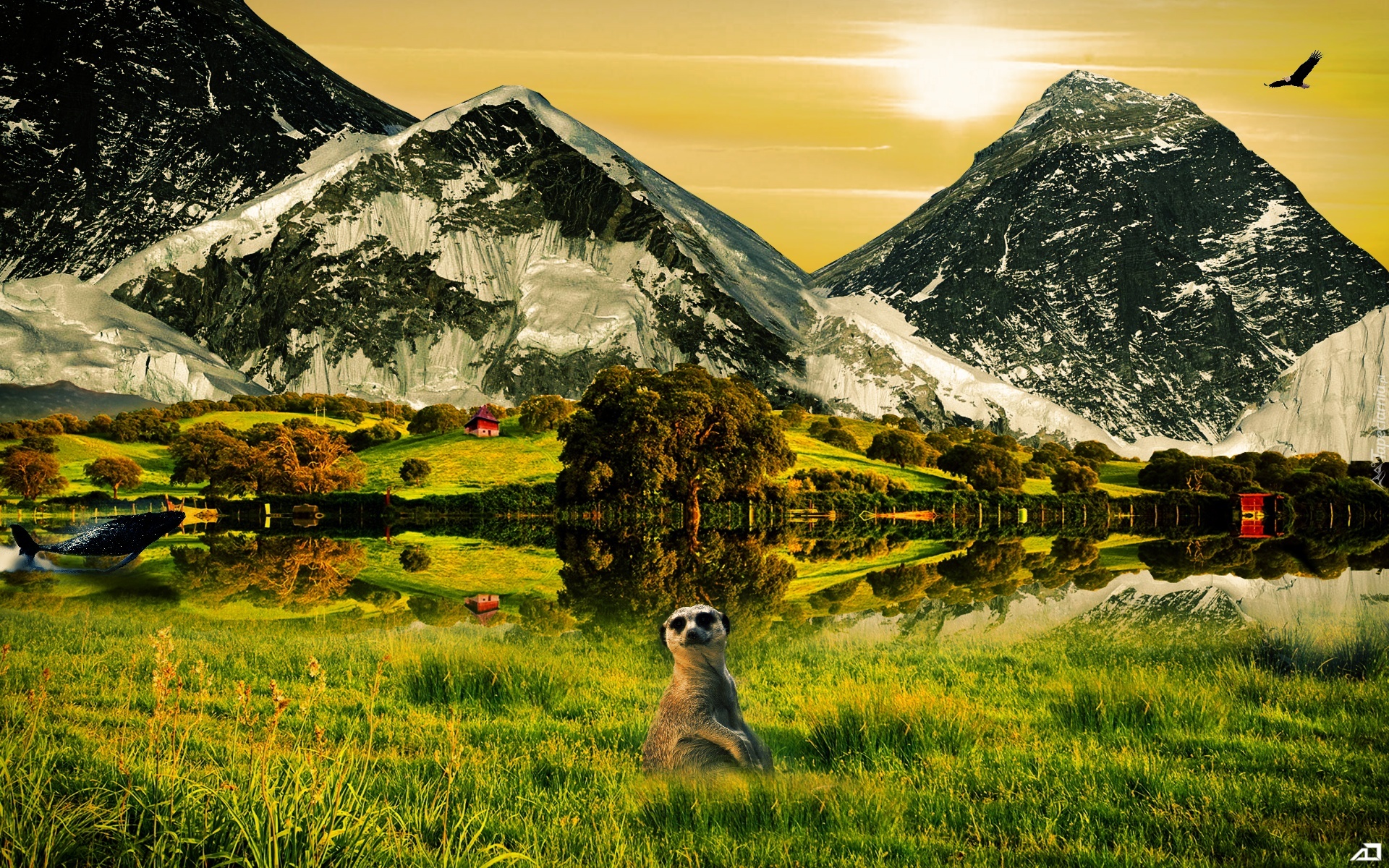 Edytor tapety: Góry, Drzewa, Trawa, Surykatka