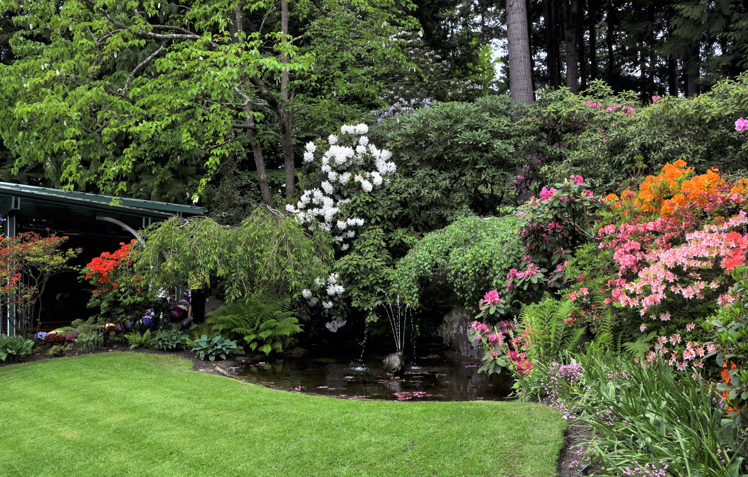 Edytor tapety: Ogród, Piękne, Kwitnące, Krzewy, Oczko, Wodne