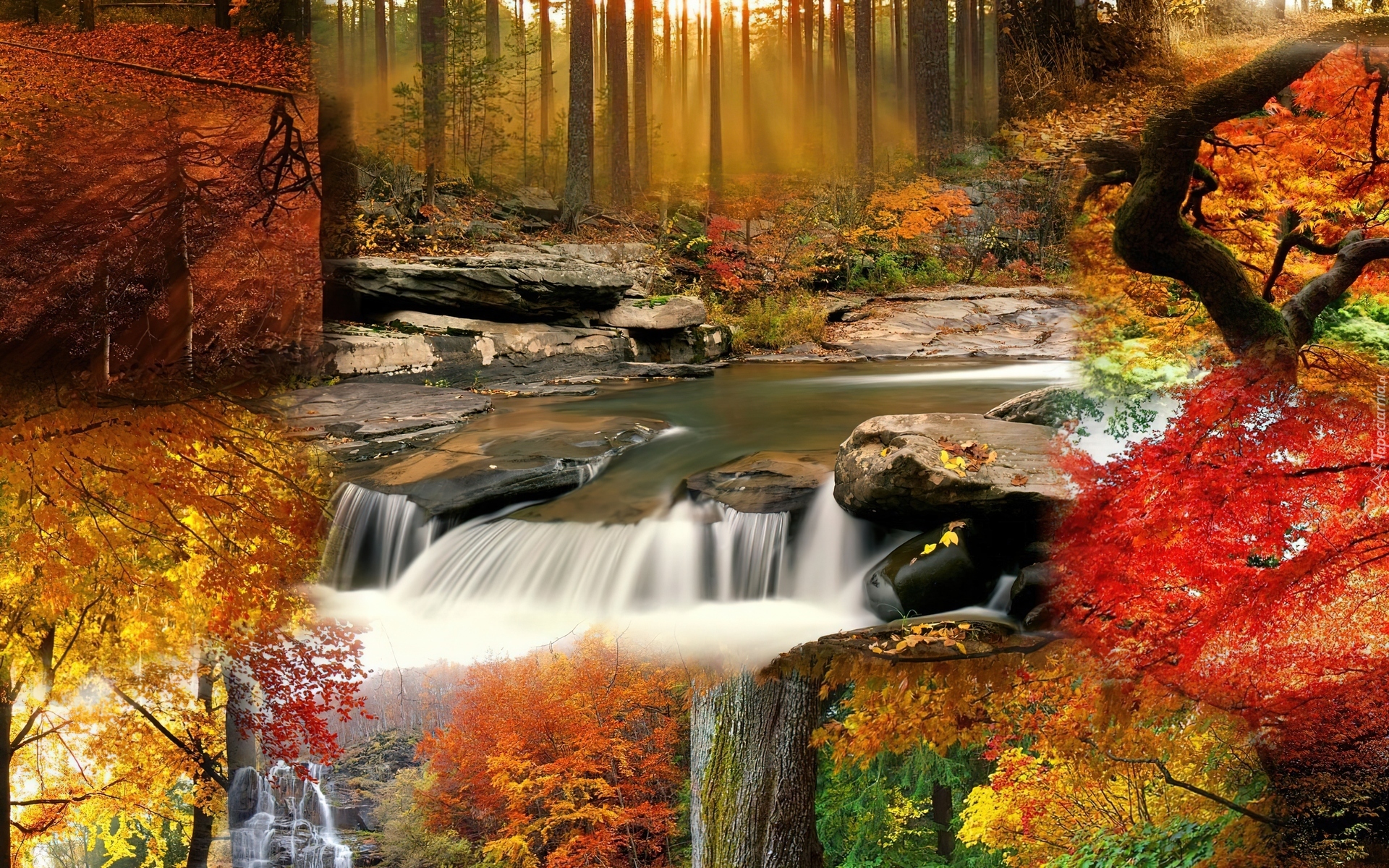 Edytor tapety: Wodospad, Kolorowe, Liście, Drzewa, Kamienie