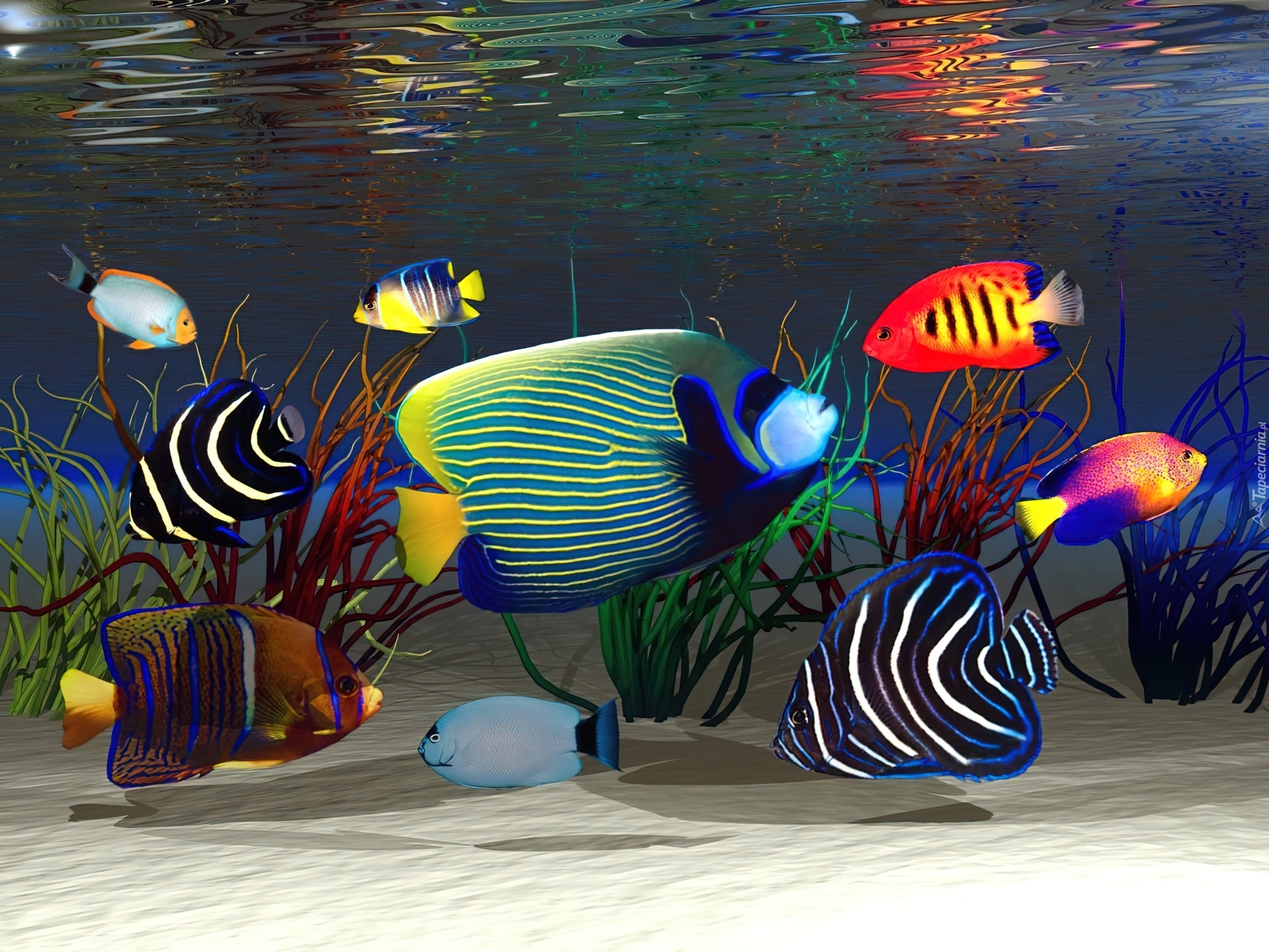 Edytor tapety: Akwarium, Kolorowe, Rybki, Woda, Roślinki, Piasek