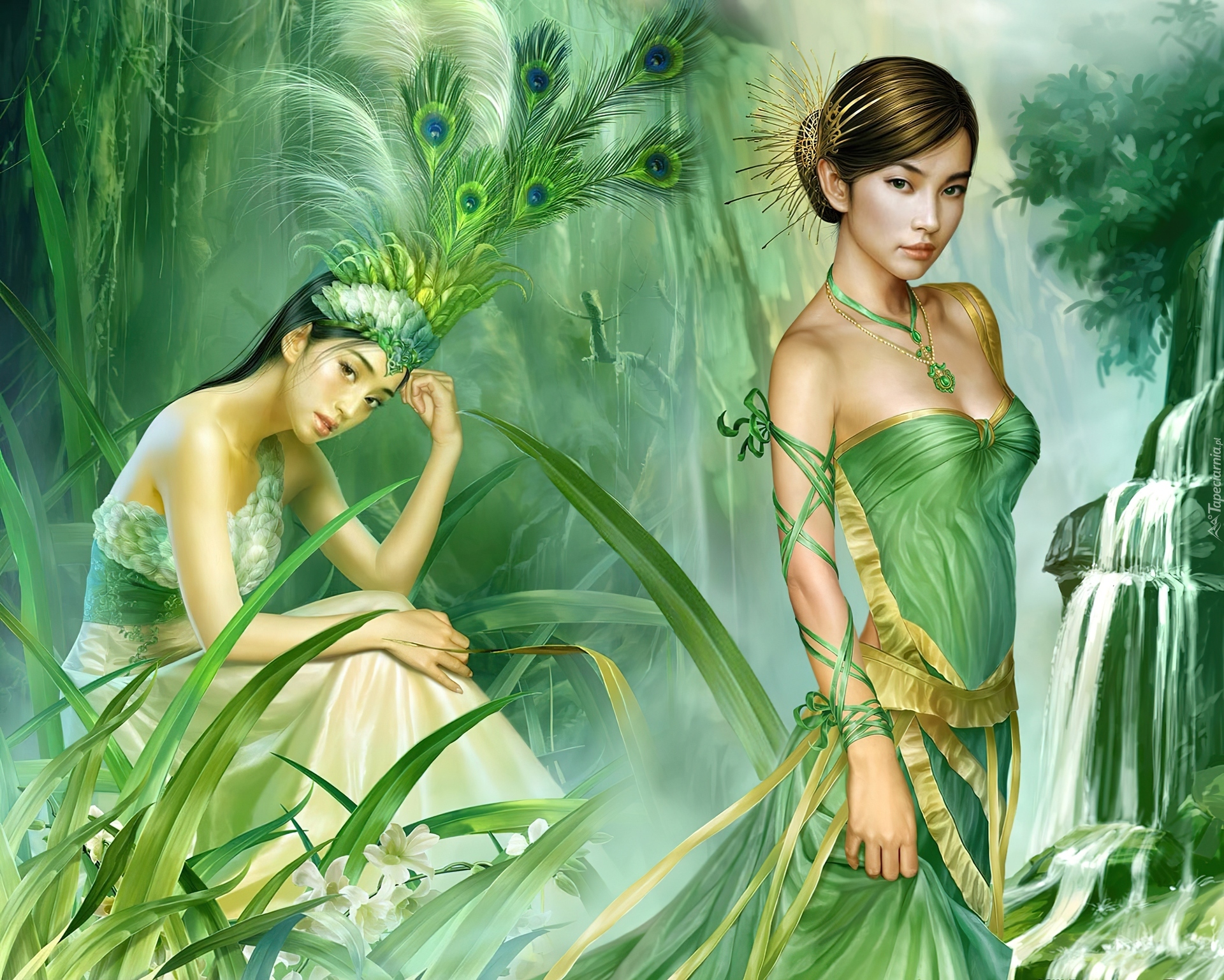 Edytor tapety: Dwie, Kobiety, Wodospad, Rośliny