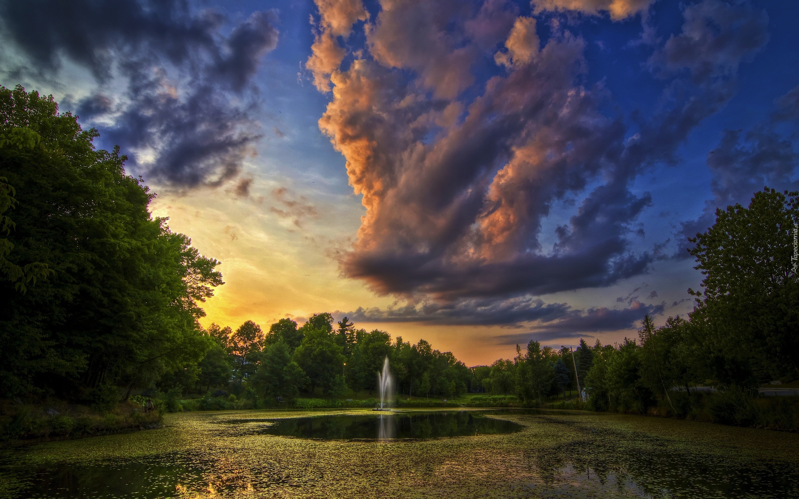 Edytor tapety: Fontanna, Drzewa, Chmury