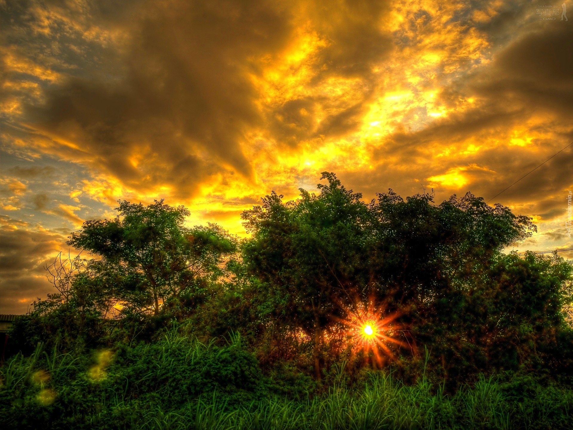 Edytor tapety: Zachód, Słońca, Promienie, Drzewka