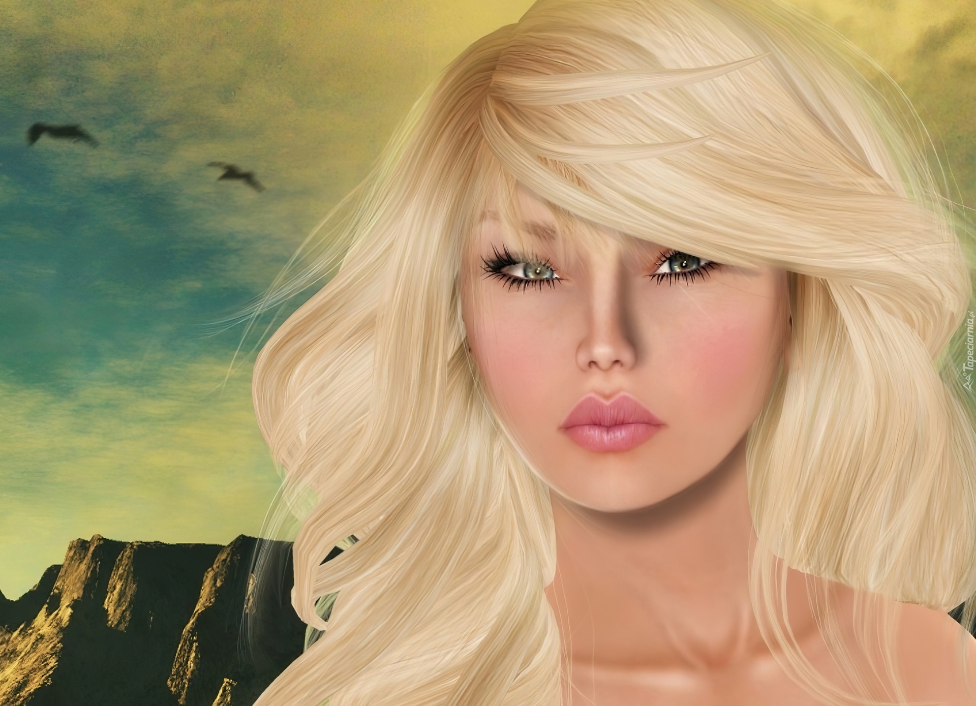Edytor tapety: Kobieta, Blondynka, Góry, Niebo