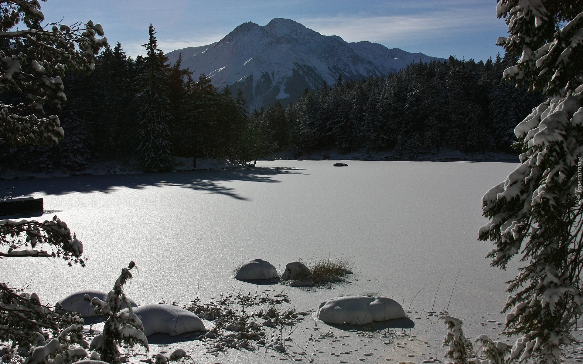 Edytor tapety: Rzeka, Zima, Śnieg, Góry, Lasy