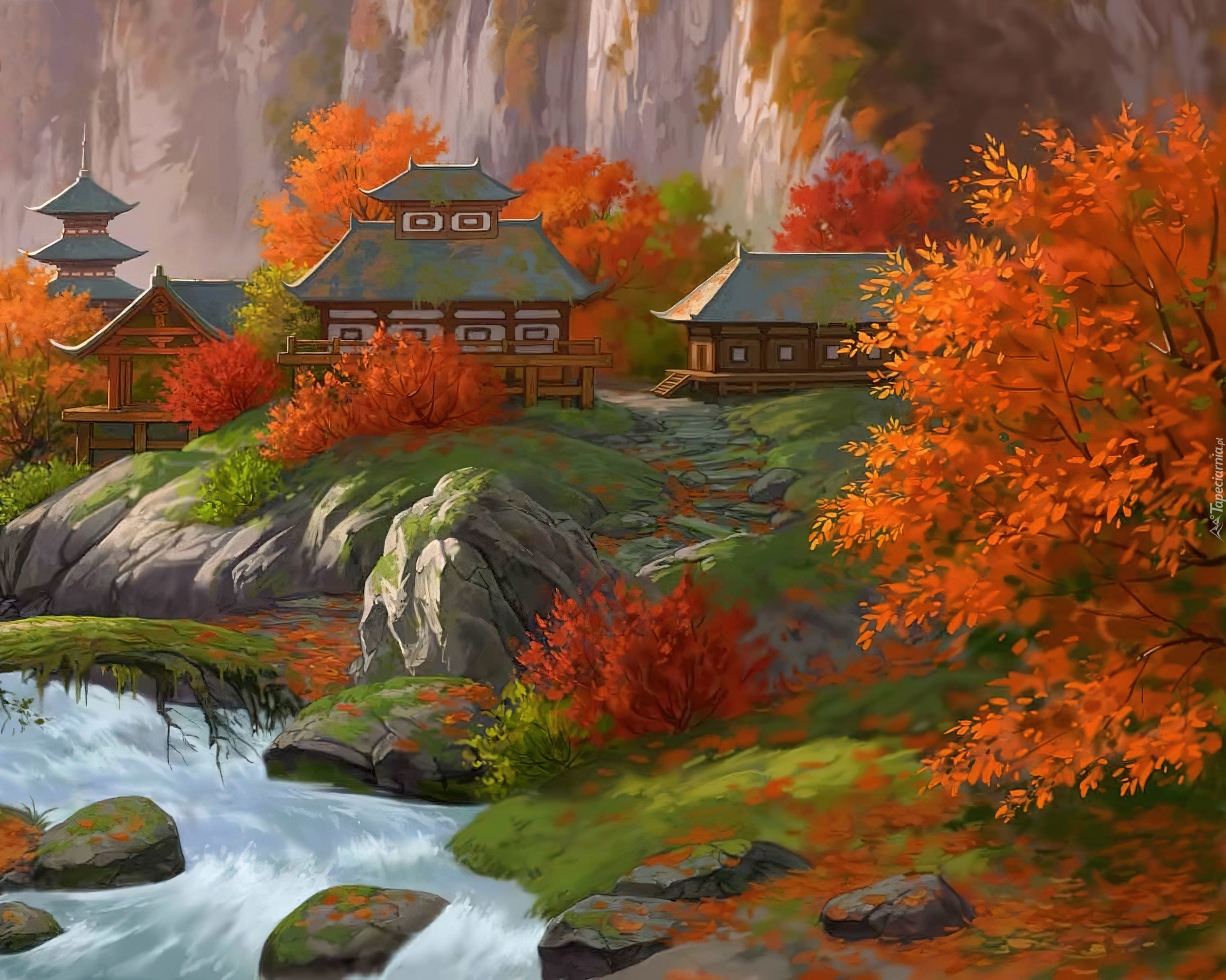 Edytor tapety: Japońska, Pagoda, Rzeka, Jesień, Malarstwo