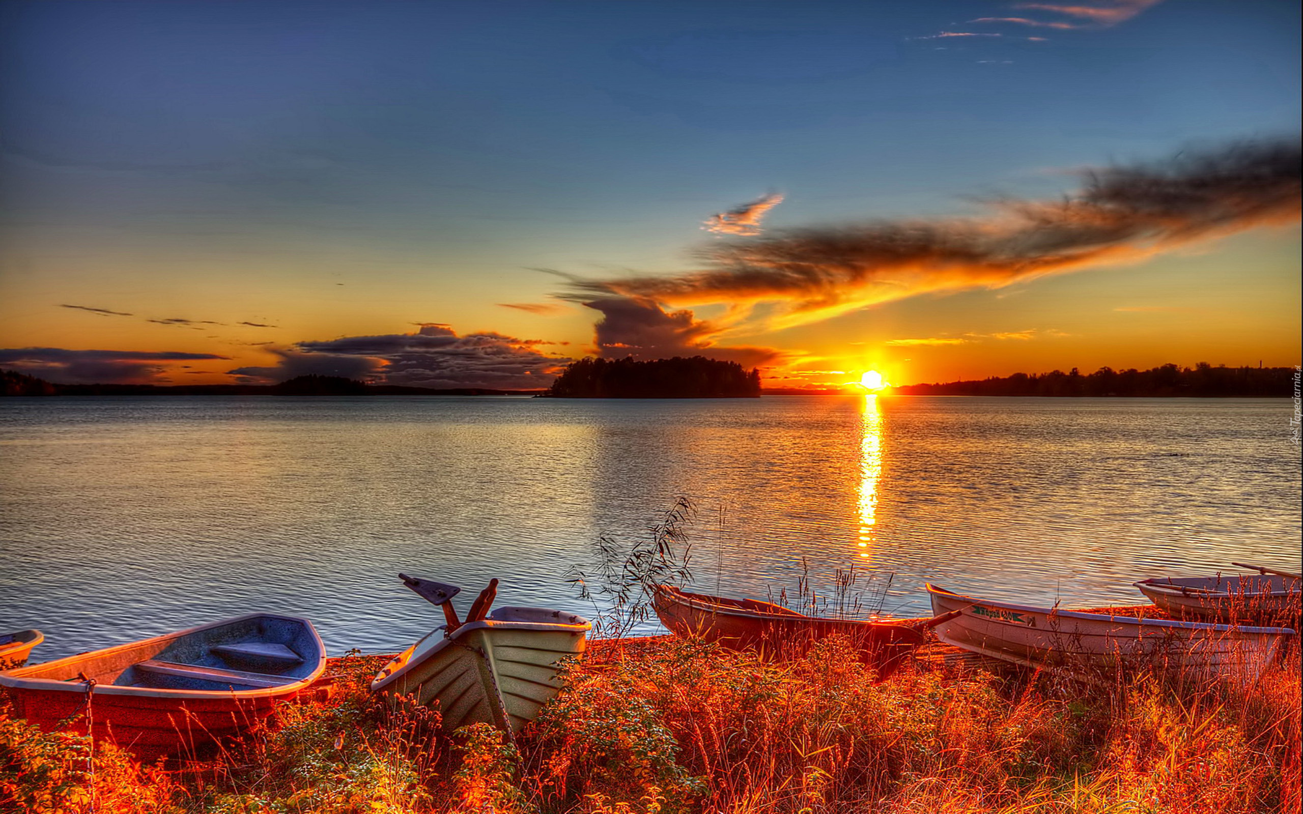 Edytor tapety: Jezioro, Łódki, Zachód, Słońca