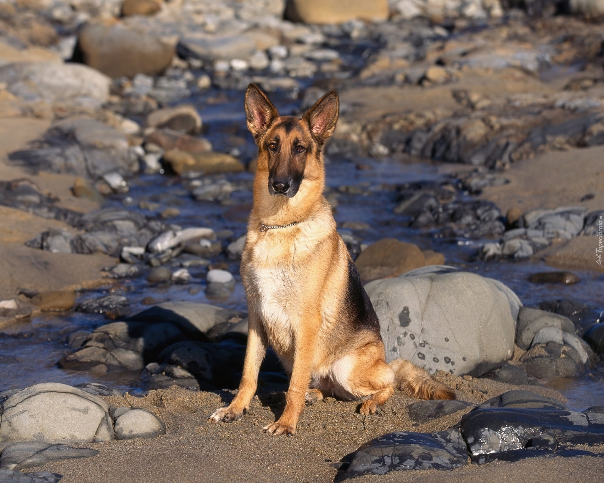 Edytor tapety: Pies, Owczarek, Niemiecki, Woda, Kamienie