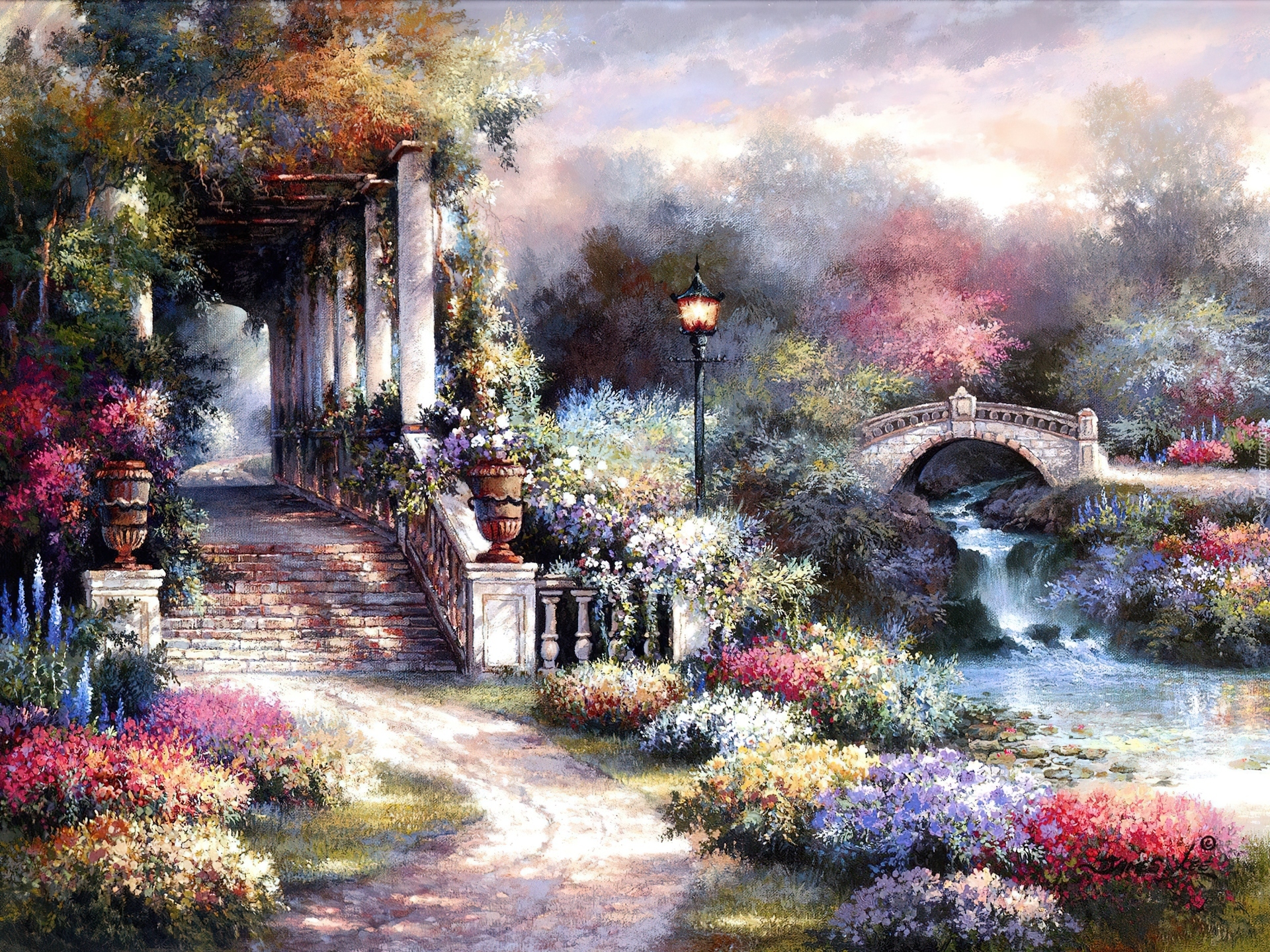 Edytor tapety: Obraz, Mostek, Rzeczka, Schody, Kwiaty, James Lee