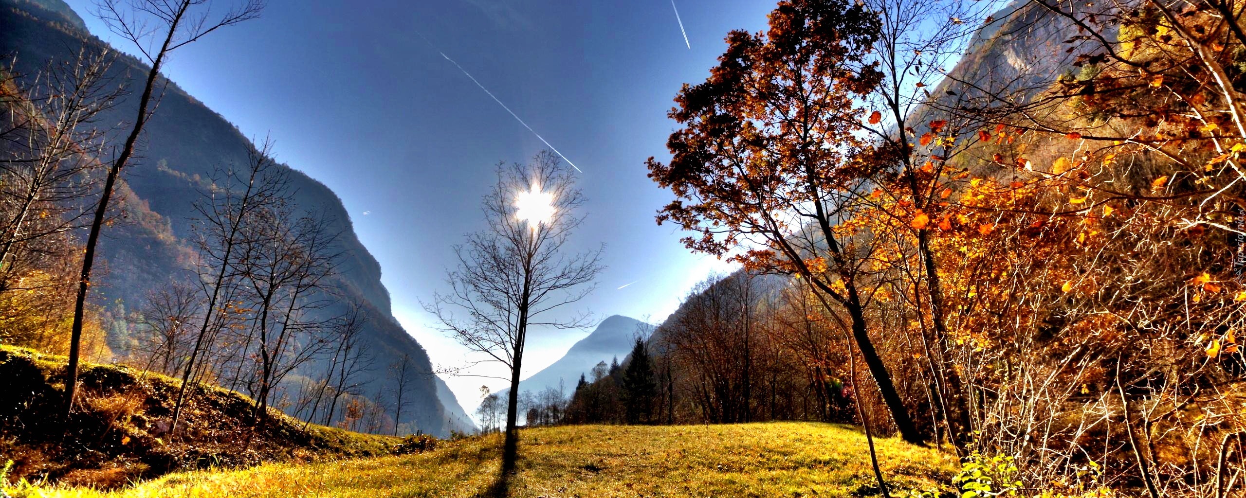 Edytor tapety: Góry, Promienie, Słońca, Drzewa
