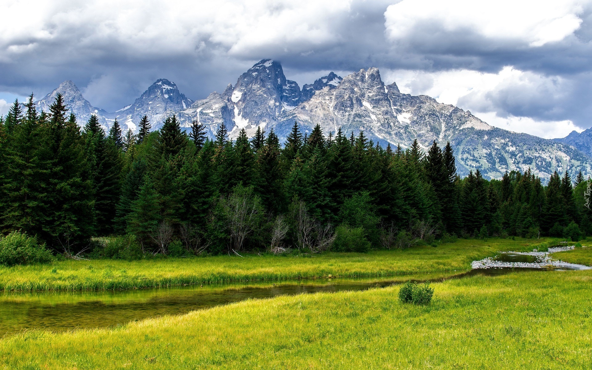 Edytor tapety: Rzeczka, Las, Ośnieżone, Góry, Chmury