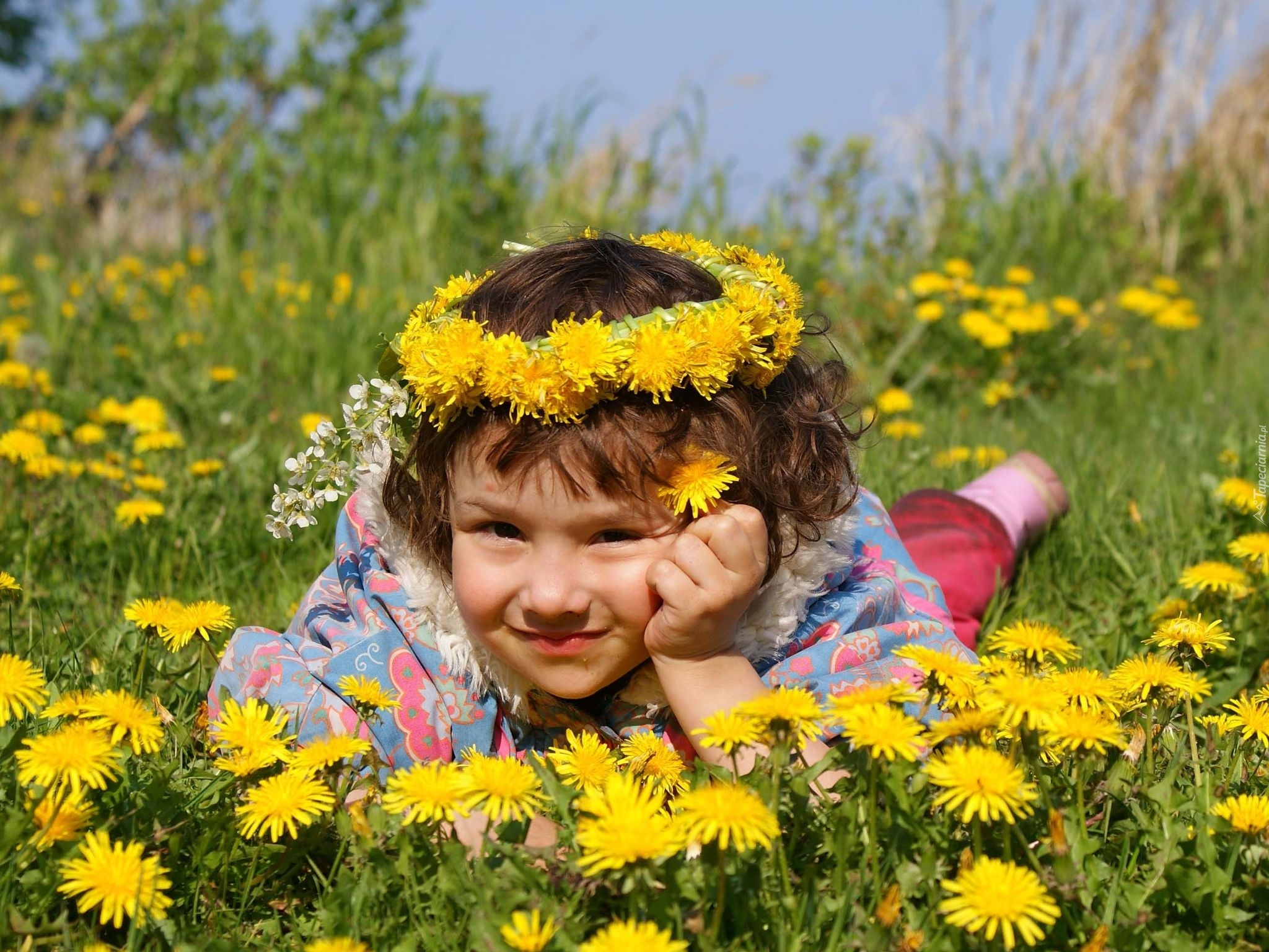 Edytor tapety: Dziewczynka, Łąka, Kwiaty, Wianek