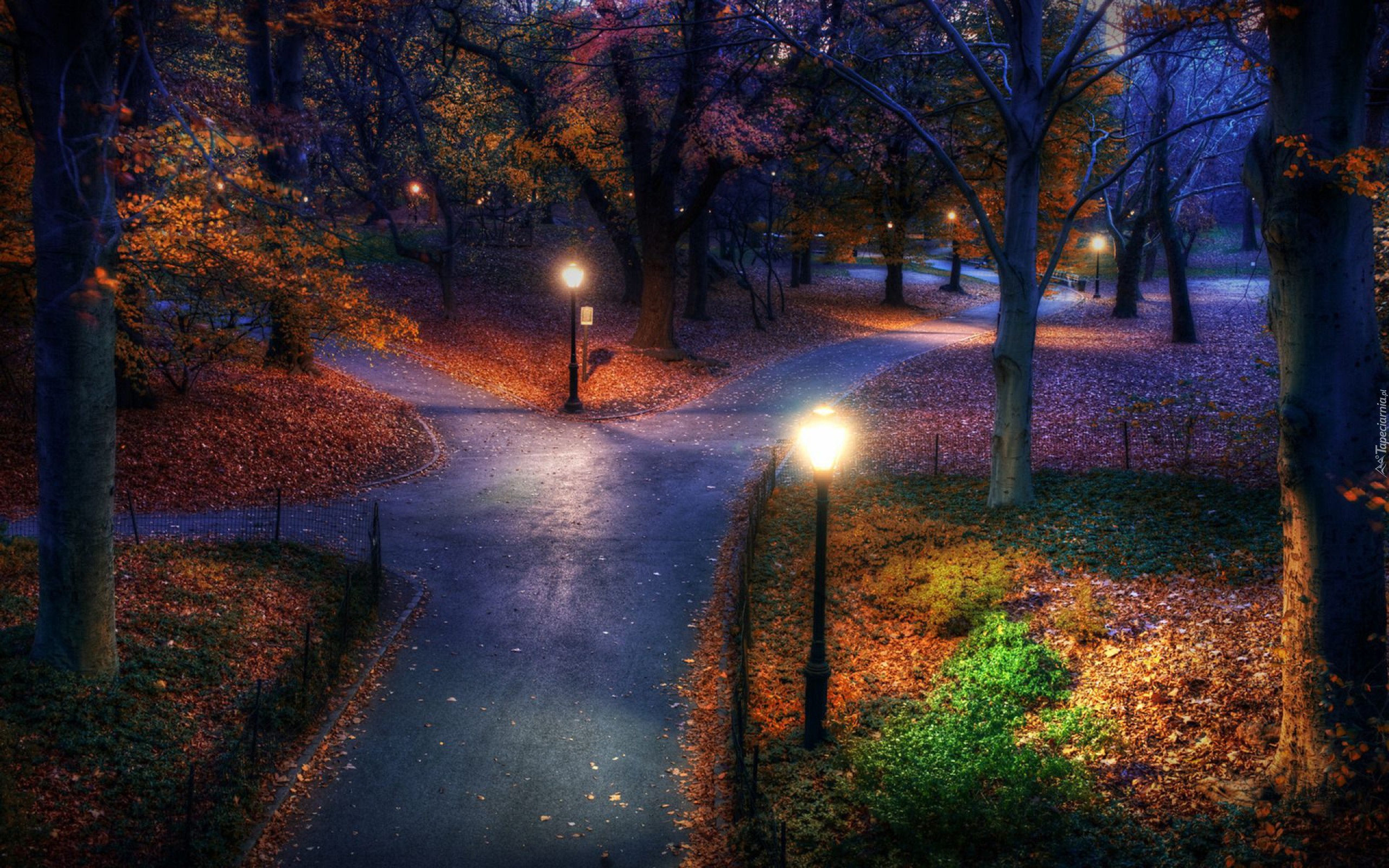 Edytor tapety: Oświetlony, Park, Nocą, Drzewa, Liście, Alleja, Spacerowa