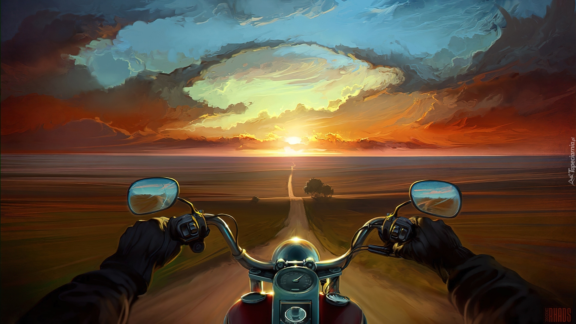 Edytor tapety: Obraz, Droga, Motocykl, Zachód, Słońca